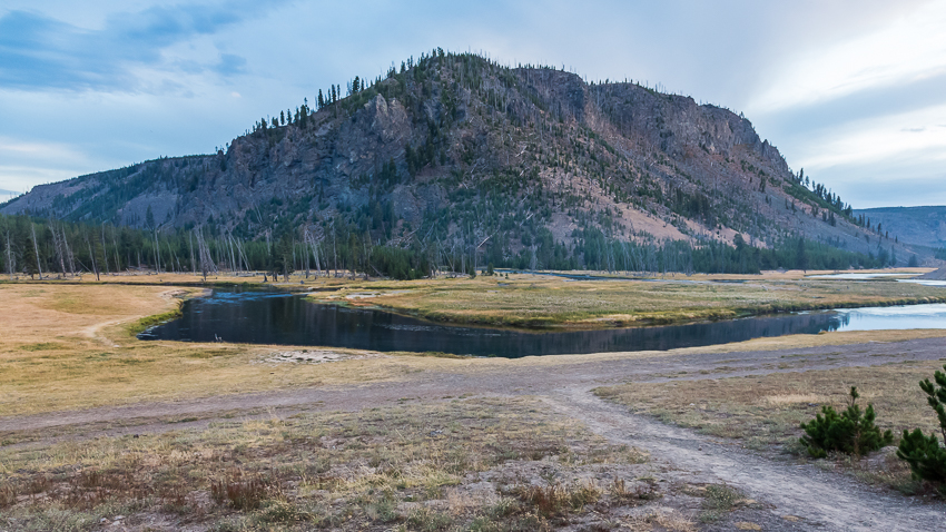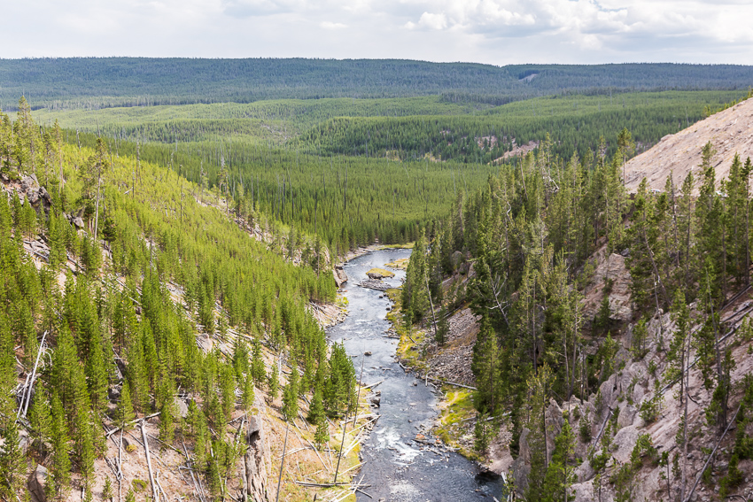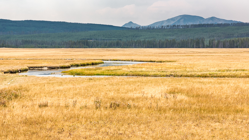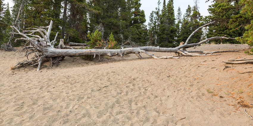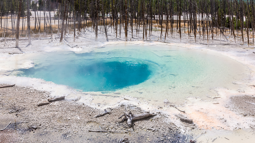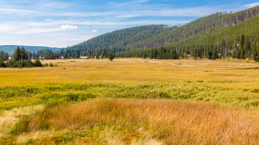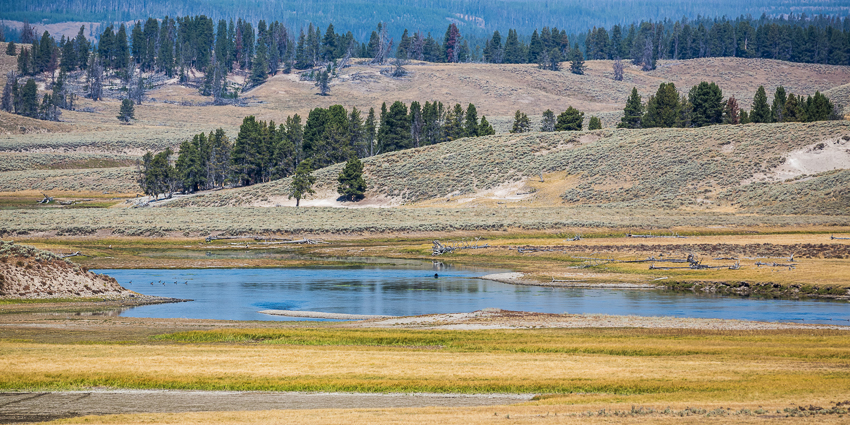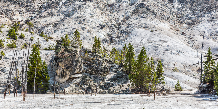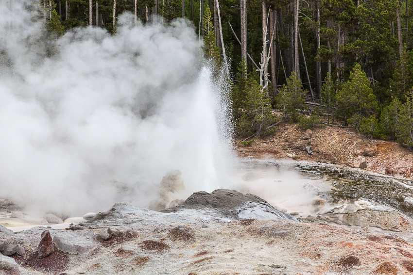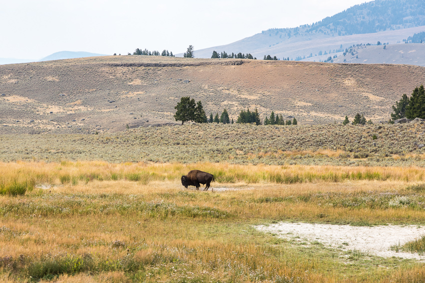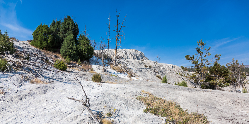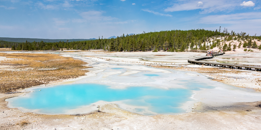 Von Mammoth Hot Spring aus ging es dann weiter über den Roaring Mountain bis zum Norris Geyser Basin. Dort liefen wir die beiden Trails „Back Basin“ und „Porcelain Basin“. Die Sonne schien phasenweise doch recht stark und so wurde uns im Laufe des Trails (in Summe waren beide irgendwas um die 5Km lang) ganz schön warm. Zum Glück hatten wir zwei Wasserflaschen dabei und so musste zumindest niemand verdursten. Nach etwas über 2 Stunden fuhren wir dann weiter Richtung Madison. Unterwegs machten wir immer wieder Halt an einzelnen Trails oder Photostops.