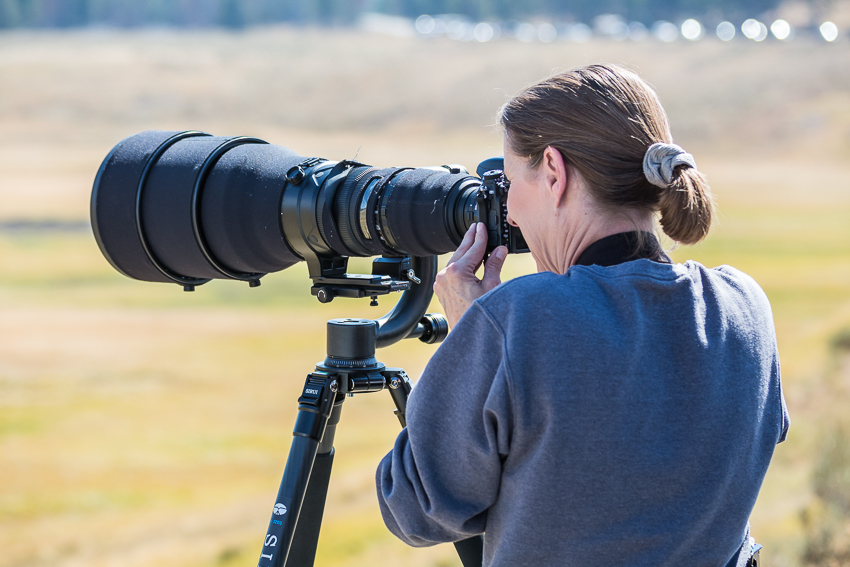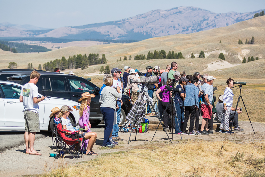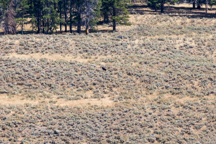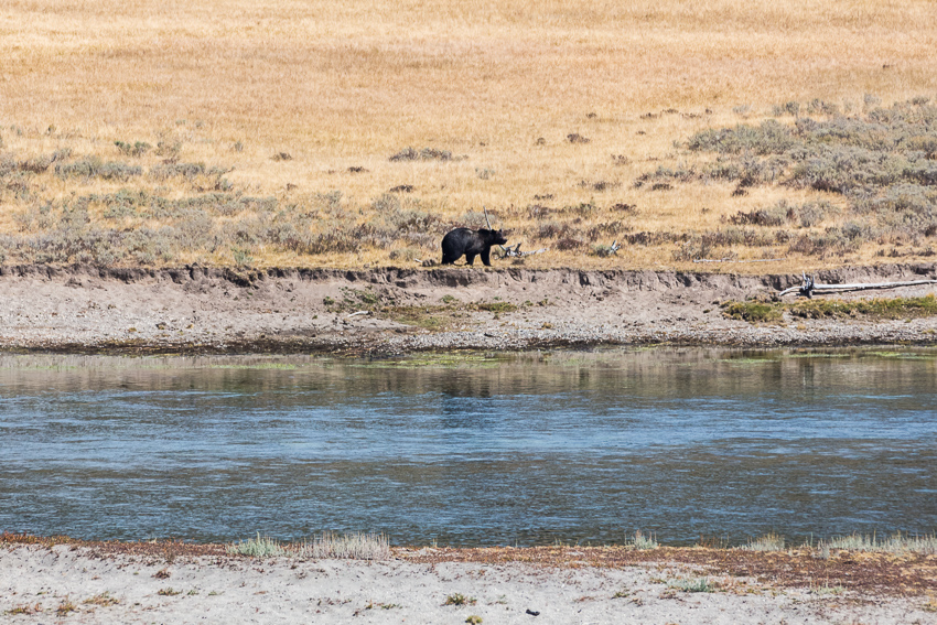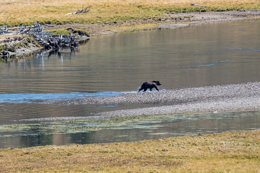 Punkt für Punkt grasten wir dann weiter die verschiedenen Highlights des Parks ab. Alleine was wir heute an Tieren zu sehen bekamen war schon der Hammer. Irgendwann sahen wir schon aus der Ferne eine Menge Autos am Straßenrand stehen. Da mit unserem Wohnmobil weit und breit leider kein Platz an der Straße zu bekommen war, stieg ich mit Paul aus während Birgit und Tom ein paar Kilometer weiter umdrehten und uns nach einer viertel Stunde wieder einsammelten. War echt blöd, ging aber nicht anders - Birgit kannte sich mit meiner Knipse nicht aus. Was wir dann aus der Ferne zu sehen bekamen war der Wahnsinn. Ein Grizzly der sich abwechselnd im Wasser tummelte oder an Land rannte, sowie eine Wolfsfamilie mit 4 Jungen die sich zügig in Richtung Wald trollten. Alles auf einen Haufen. Ich kam mir mit meinem 70-200mm Objektiv + Extender allerdings total mickrig vor. Überall waren Stative mit großen Brennweiten ab 500mm aufgebaut. Ich fragte eine Fotografin mit einer Riesentüte an ihrer Kamera, ob ich mal kurz durchschauen dürfte - und holla die Waldfee, das war schon eine andere Hausnummer. Cropcam mit großem Tele ist für Tierfotografie halt schon was anderes als Vollformat mit mittlerem Zoom.