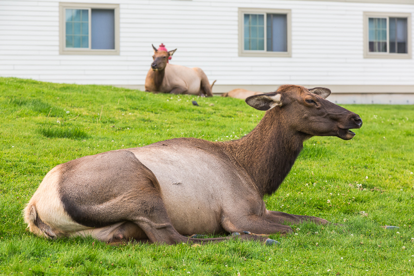 Bevor wir dann die 1/4 Meile bis zum Campground hinter uns brachten, gingen wir noch etwas „Wapiti Hirsche schauen“. Die waren in der City überall auf dem Grün verteilt und fraßen sich genüsslich am Gras die Wampe voll. Man konnte bis auf wenige Meter an die Tiere ran, ohne dass diese auch nur einen Funken Angst oder Nervosität zeigten. Als dann immer mehr Menschen sich den Wapitis bis auf wenige Meter näherten, hörte man von der anderen Straßenseite die Rangerin in ihr Megafon plärren, man soll doch etwas mehr Abstand zu den Tieren halten.