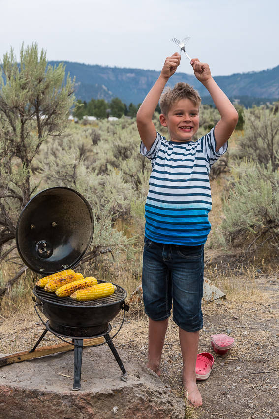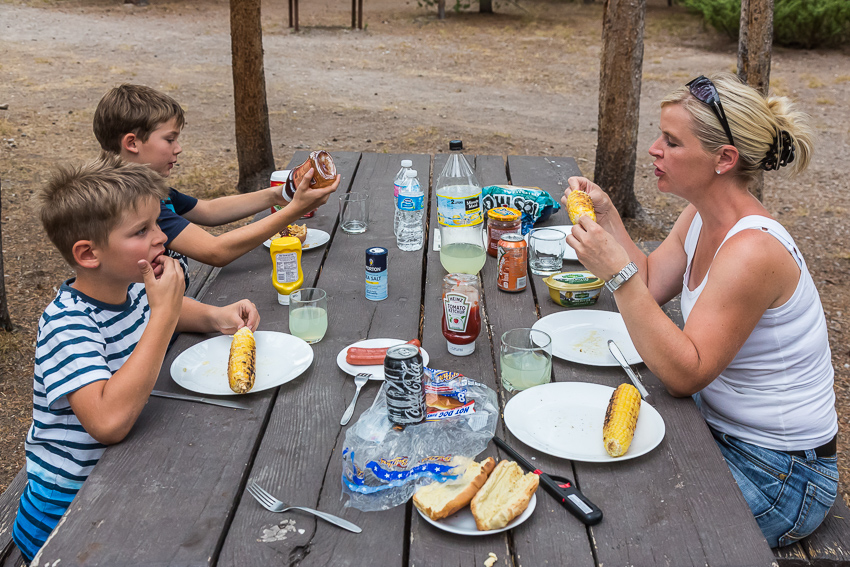 Langsam wurde es warm und wir fuhren weiter Richtung Cody. Dort angekommen fragte Birgit im Visitor Center nach dem nächsten Post Office - das war aber recht umständlich zu finden und für größere Wohnmobile schwer zugänglich. Der Weg führte uns kurz vor Ortsausgang in den nächsten Walmart. Dort machten wir erst mal unplanmäßig Mittag bei Subway, bevor wir noch einmal 8 Maiskolben und das leckere "Fun Pops" Wassereis kauften. Wir tankten unser Wohnmobil zum zweiten Mal am heutigen Tag auf, dann brachten wir endlich die letzten Kilometer bis zu unserem heutigen Campground hinter uns - dem "Fishing Bridge" am Osteingang des Nationalparks.