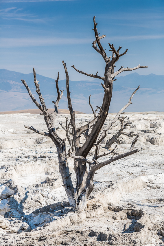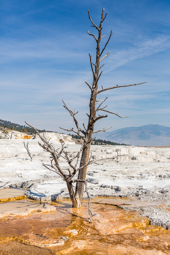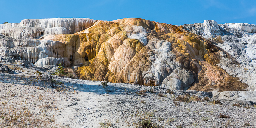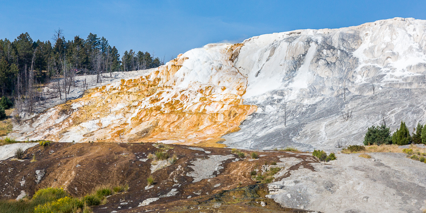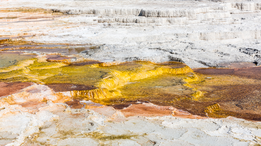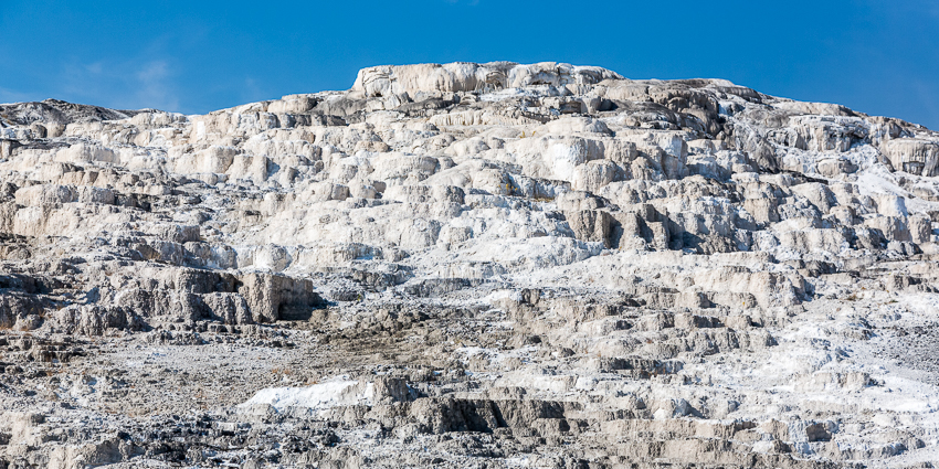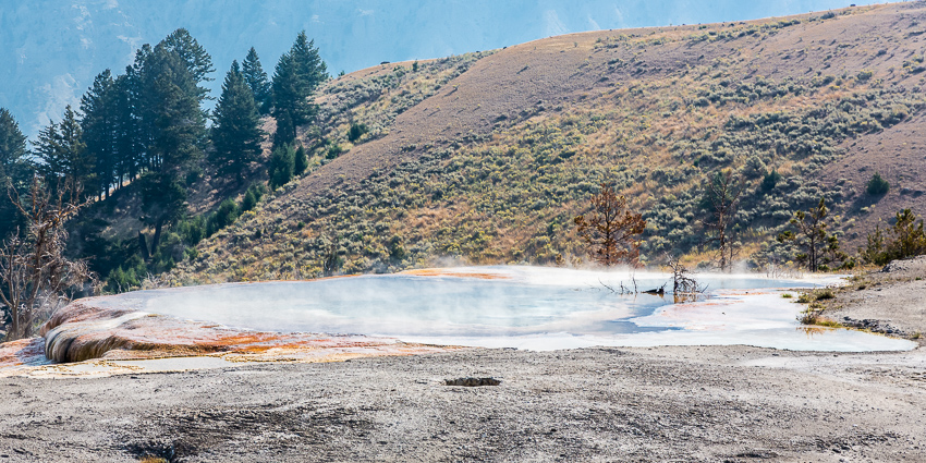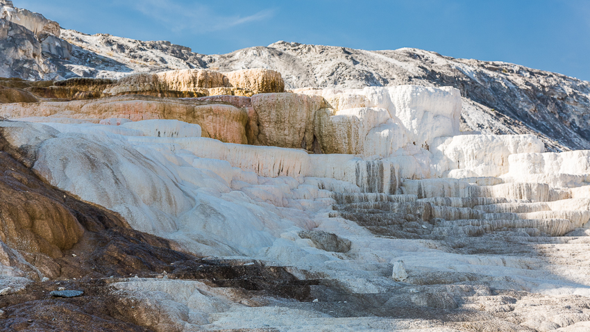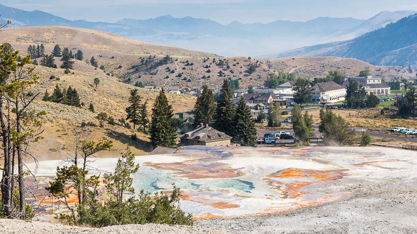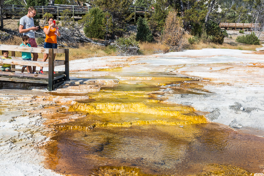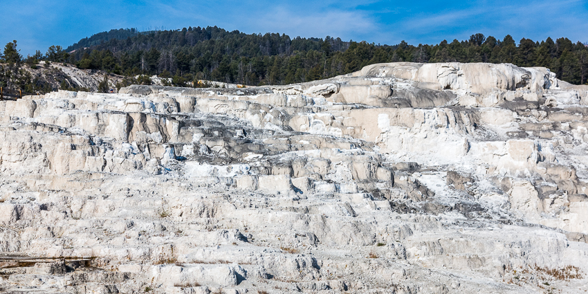 Um kurz vor 10.00 kamen wir dann endlich vom Platz und fuhren dann wieder zurück Richtung Mammoth Springs. Dort besuchten wir die Lower und Upper Mammut Hot Spring Terraces. Ich muß zugeben, der Lower Bereich war eine leichte Enttäuschung, da es den Eindruck machte, dass alles relativ ausgetrocknet war. Bei den Upper Terraces sah die Sache dann schon etwas anders aus und die Stimmung hellte sich gleich wieder auf.