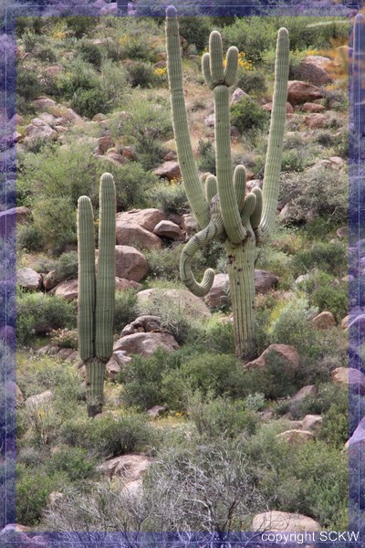 Felsen, Saguaros und auch noch blühende Blumen –meist in gelb.