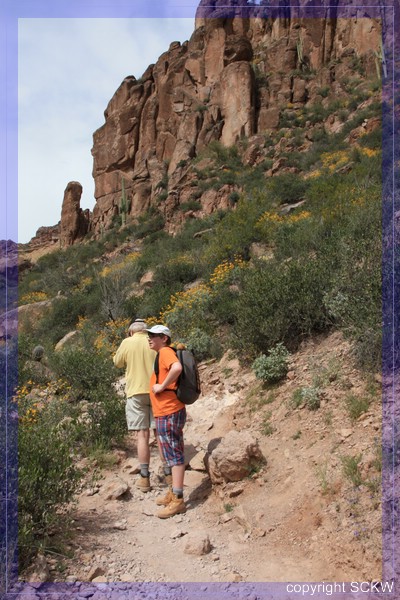 Nach gut 70 Minuten sind wir schon recht hoch gekommen, allerdings ist nicht abzusehen, wie weit es nun noch bis zum Fremont Saddle und der Aussicht auf den Felsen "Weavers Needle" ist. Sollten wir doch mal über ein GPS-Gerät oder so nachdenken? In Anbetracht des für meinen Knöchel sicher anstrengenden Abstiegs und einigen heranziehenden dunklen Wolken kehren wir also um.