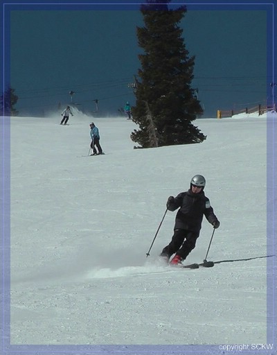 So ganz vernachlässigen wir auch die anderen Pisten, zumindest die ohne Buckel, nicht. Mit Sonne macht das doch gleich doppelt so viel Spaß. Nur die Sessellifttouren lehren uns auf ganz praktische Weise die Bedeutung des Windchill-Faktors. Und auch der Name der kleinen Hütte oben "Warming Hut" macht gleich mehr Sinn. Ich vermisse meinen Schal! Immer wieder hören wir auch Donner von Lawinensprengungen, wir gehen daher davon aus, dass der T-Bar am Peak 7 immer noch zu ist.