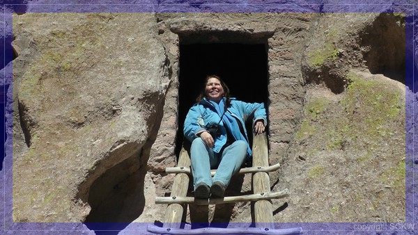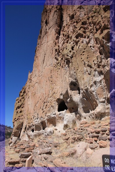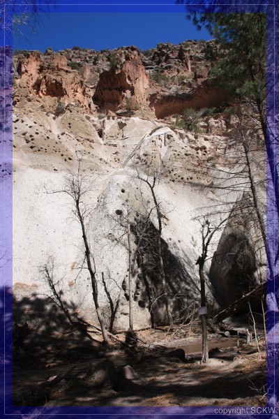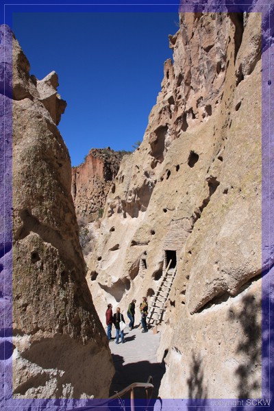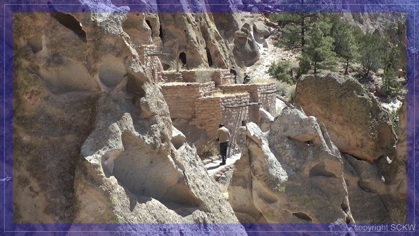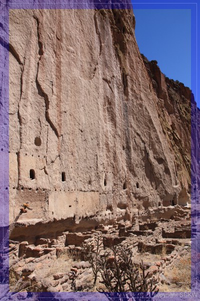 Wir fahren also weiter nach Südosten. Sobald wir in die Gegend von Los Alamos kommen, ist auch klar ersichtlich, wer hier Hauptarbeitgeber ist.  Bekannt geworden ist der Ort ja durch den Bau der ersten Atombomben im Manhattan Projekt. Noch heute gibt es hier das Forschungszentrum National Laboratory. Wir sehen also in den Bergen Sperrzäune, codierte Hinweisschilder und eine riesige Satellitenschüssel. Das alles ist aber nicht unser Ziel, sondern der Canyon des Frijoles Creek .  Hier an diesem Flüsschen, der als einer der wenigen auf diesem Plateau ganzjährig Wasser führt, haben einst die Vorfahren der Pueblo-Bewohner gesiedelt. Die Überreste können im Bandelier National Monument besichtigt werden.