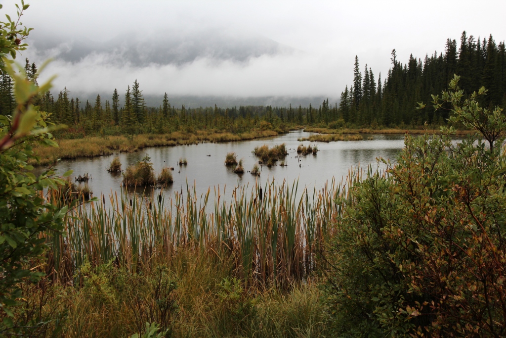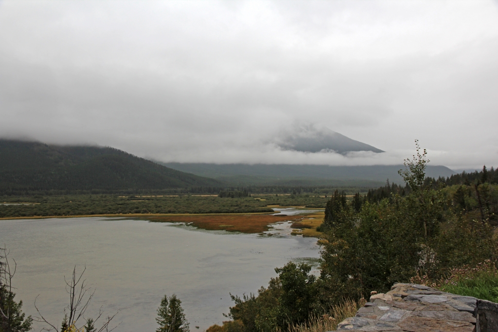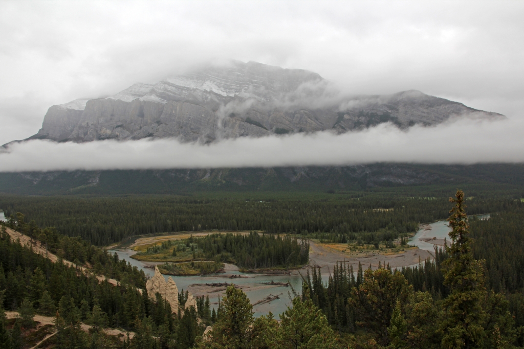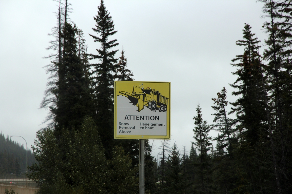 Also fahren wir zunächst auf dem Bow Valley Hwy nach Norden, leider dank tiefhängender Wolken ohne Ausblicke. Die Luftdruckanzeige im Auto mahnt bei allen Reifen zu geringen Druck an – ich vermute mal, daß das eine Frage der niedrigen Temperatur ist. In Castle Junction findet sich eine Tankstelle mit Druckluftschlauch, wo wir nachfüllen dürfen. Das Prüfgerät habe ich in München vergessen, bekomme aber eines geliehen. Ich befülle die Reifen ein Stück über den im Bordcomputer empfohlenen Wert und bezahle mit einem Tip.