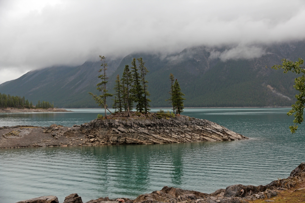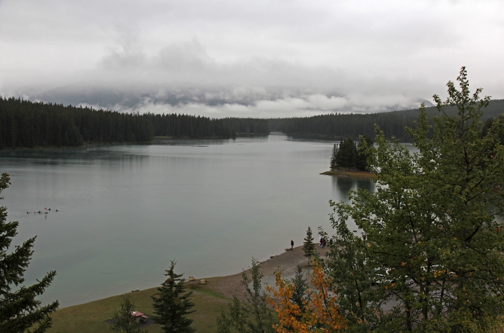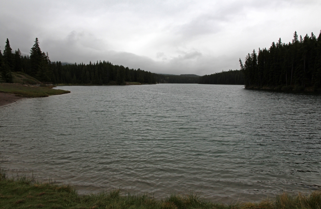 Da wir nicht solange im feuchten und kühlen Freien herumlungern wollen, fahren wir halt wieder runter nach Lake Louise. Dort fahren wir zum gleichnamigen See und parken im Bereich von dem großen Hotel, das für unseren Geschmack nur als grauenhaft zu beschreiben ist. Demgegenüber könnte der See wohl ganz hübsch sein, wenn er sich nicht im grau-in-grau präsentieren würde. Zudem herrscht ein ziemlicher Rummel, so daß wir keine Lust haben, dort etwas Eßbares zu suchen.