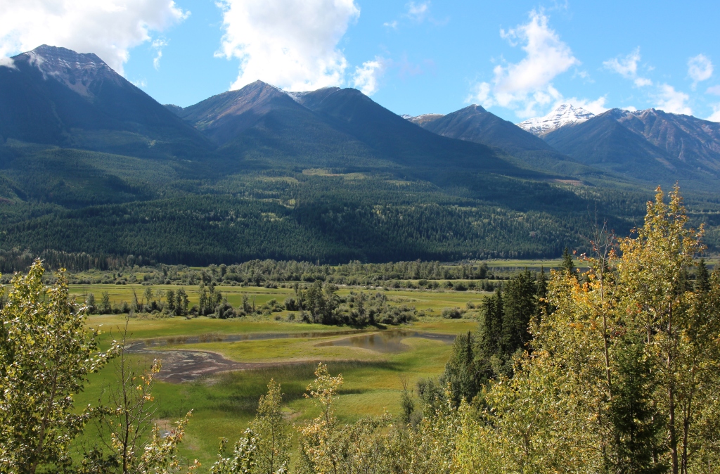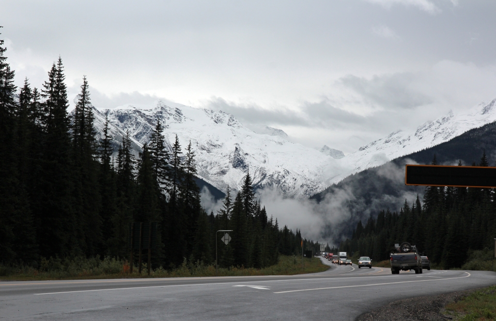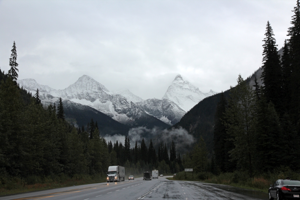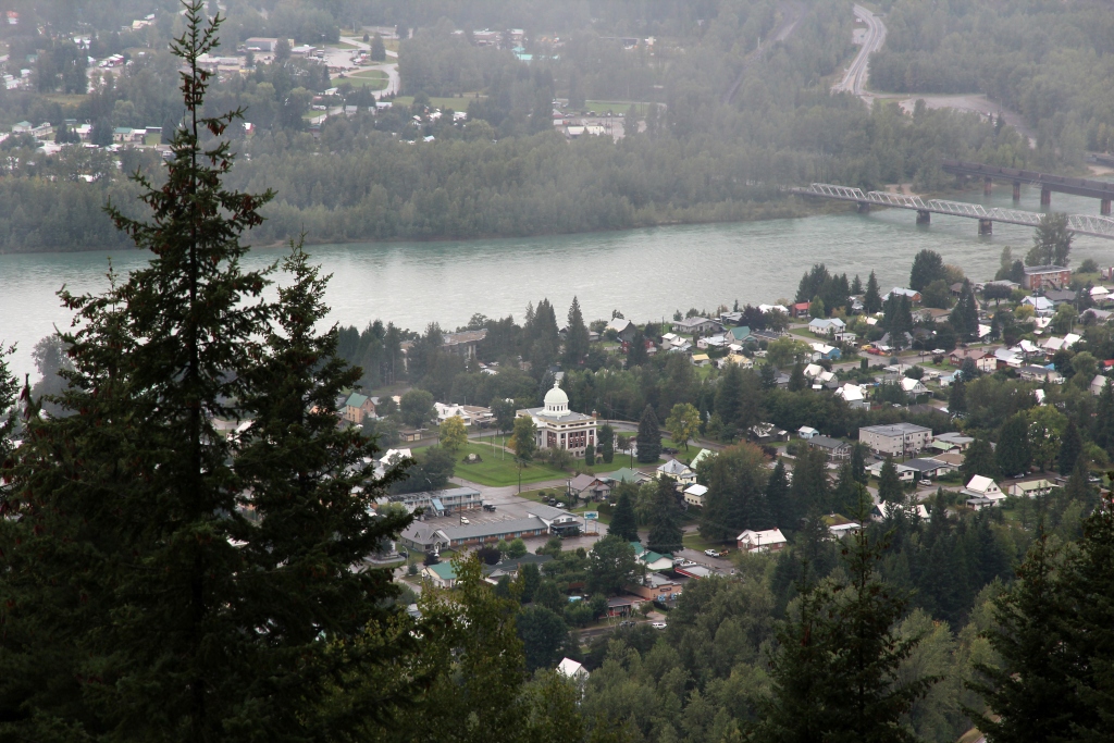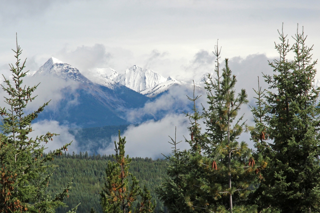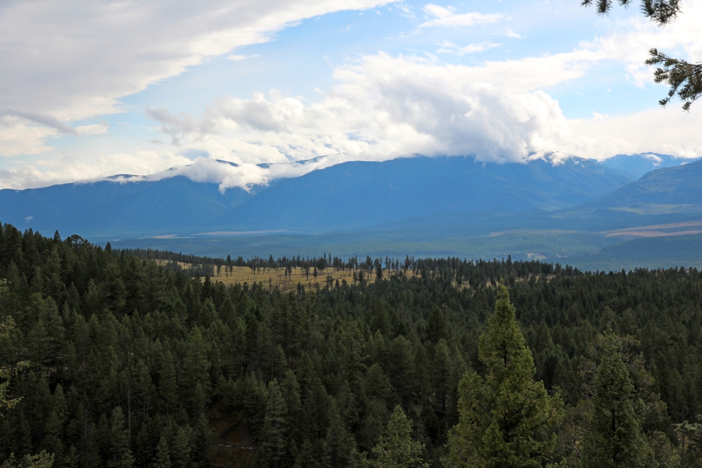 Nach nicht allzu langer Fahrt kommen wir zum Kootenay Valley Viewpoint, wo wir amerikanische Touristen treffen, die mit Zelt unterwegs sind und nach ihren Schilderungen ziemlich kalte Nächte verbracht haben. Die Sicht am Viewpoint ist leider ziemlich eingeschränkt. Es schließt sich eine schier endlose Fahrt an zunächst am Fluß entlang und durch Wald. Es ist zwar trocken, aber Berge sind total eingehüllt (falls denn welche da sind – nur manchmal kann man sie erahnen).