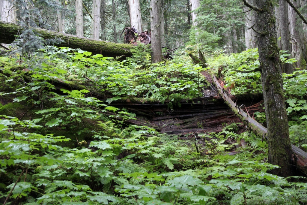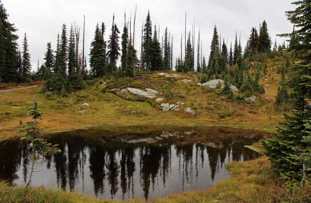 Den ersten Halt legen wir schon am Ortsausgang von Radium Hot Springs ein, um einen kurzen Blick auf die dortige Schlucht – den Sinclair Canyon – zu werfen. Dann fahren wir in den Kootenay NP, wo nach nicht allzu langer Strecke der Olive Lake neben der Straße zu erreichen ist. Der Weg kurze ist ganz hübsch, der See soll angeblich äußerst fischreich sein, wir bekommen aber keinen einzigen zu sehen. Auch der Ranger, der als wir zurück zum Auto kommen gerade die Mülleimer leert, hat keine plausible Erläuterung für uns.