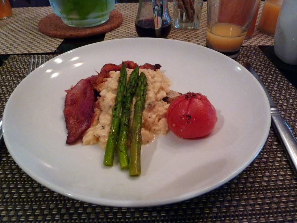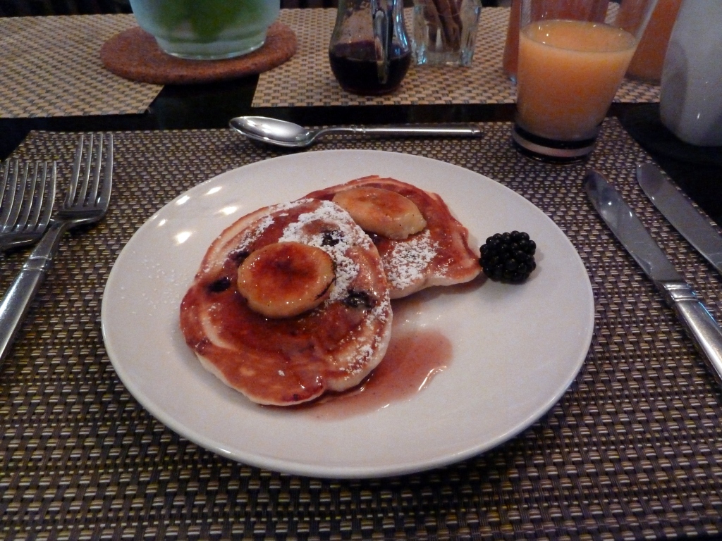 Heute haben wir phänomenal gut geschlafen, sind aber dennoch früh wach. Da es hier kein Frühstück gibt, verköstigen wir uns im Zimmer mit Banane, Keksen und Kaffee aus der Maschine.