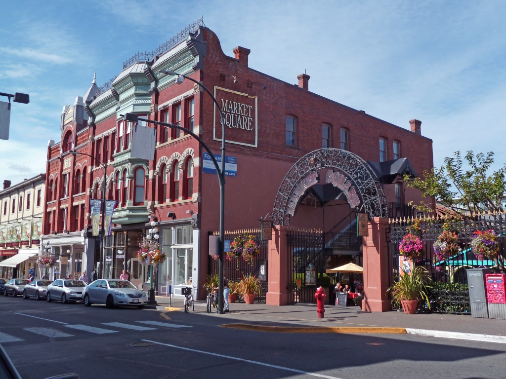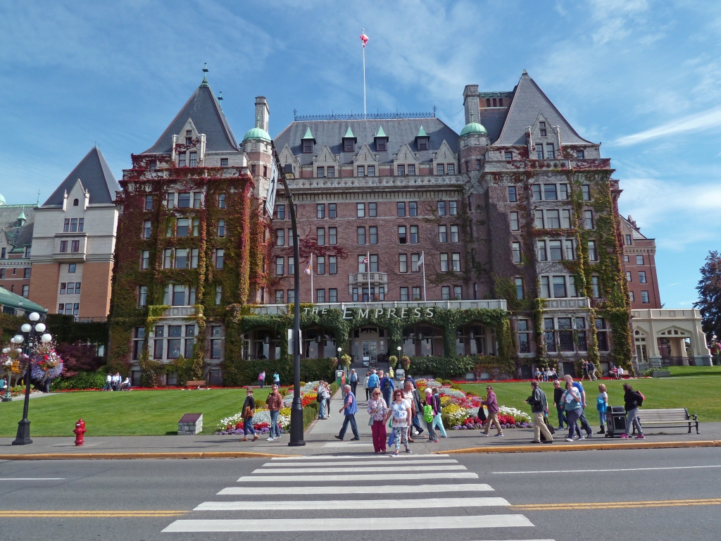 Wir wollen uns nach Hop-On-Hop-Off Touren erkundigen und marschieren zu Fuß zum Visitor Center. Doch Busfahrplan gibt es dort keinen. Daher marschieren wir weiter zur – zum Glück nahen – Abfahrtstelle am Empress Hotel. Offenbar haben wir gerade einen Bus verpaßt; jedenfalls geht der nächste erst in knapp einer Stunde. Da wir Hunger haben und zunächst etwas essen wollen, verschieben wir – wie sich herausstellt glücklicherweise – den Fahrkartenkauf auf später.