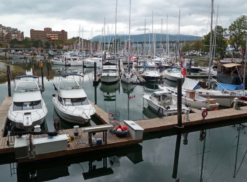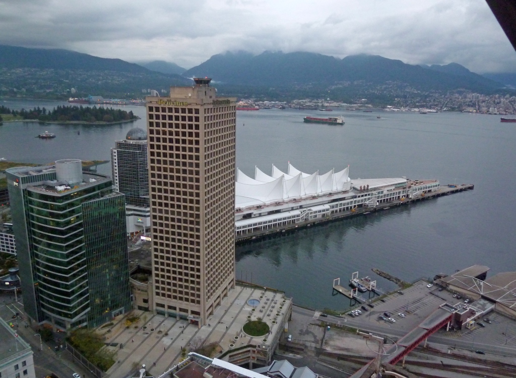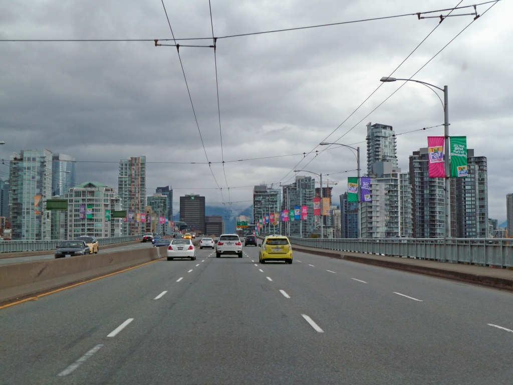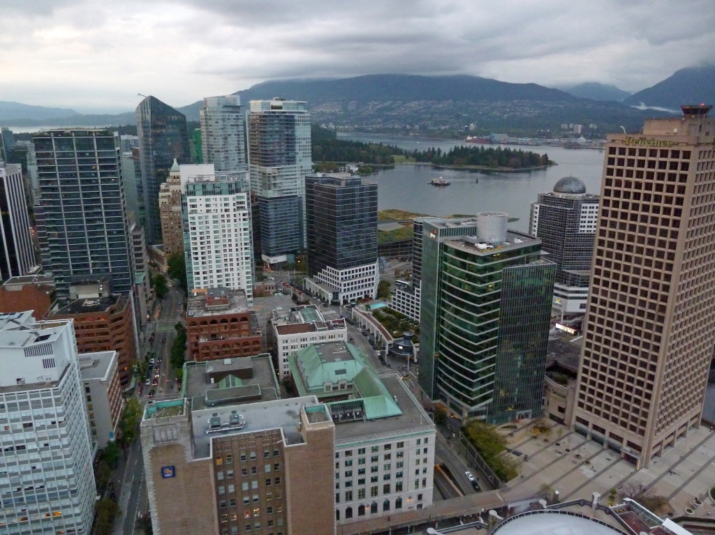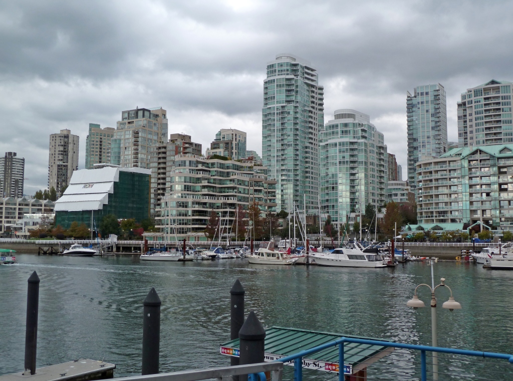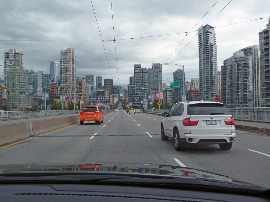 Die Fahrt nach Vancouver nach dem Deboarden verläuft recht zügig. Den Weg kennen wir ja schon im Wesentlichen, denn wir sind wieder im Residence Inn Downtown eingebucht. Die Fahrt führt an der Flughafenregion vorbei und über die Granville Bridge in die Hochhauslandschaft von Vancouver. Kurz nach 13:00 treffen wir am Hotel ein und können zu unserer Freude das Zimmer schon beziehen. Es ist riesig, diesmal in der 15. Etage mit Blick auf die Stadt und sogar mit Balkon. Wir gönnen uns eine kurze Pause mit Kaffee und Banane.