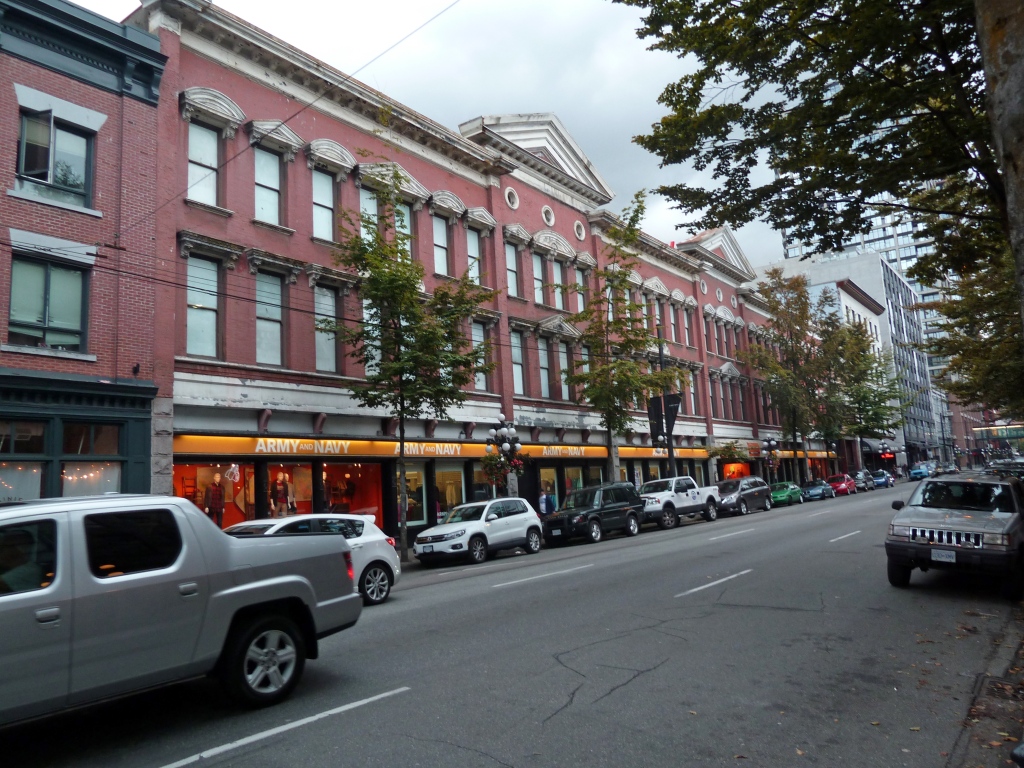 Anschließend schlendern wir nochmals durch Gastown, natürlich müssen wir die Dampfuhr in der Water Street mit ihrem Spiel besichtigen. Die parallel verlaufende W Cordova Street empfinden wir streckenweise als schon eher grenzwertig von der Qualität. Neben schönen alten Häusern und einem tollen neuen Hochhaus befinden sich ziemlich sanierungsbedürftige Quartiere.