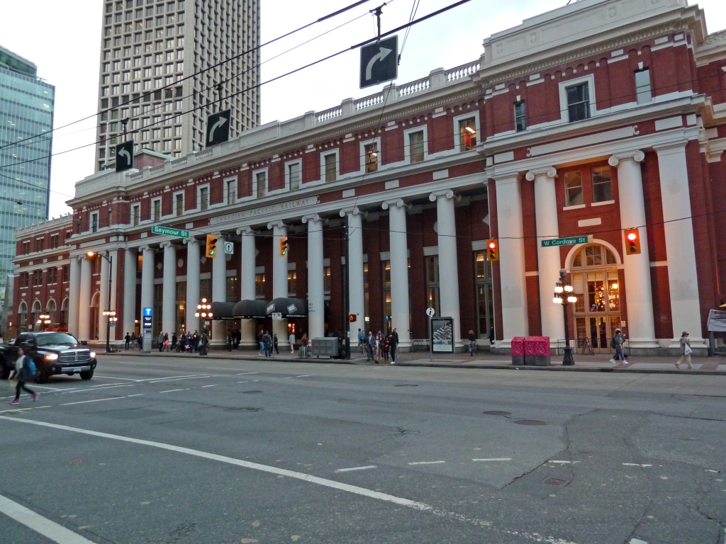 Nachdem wir wieder zurück zur Haltestelle gegangen sind fahren wir weiter bis Gastown. Auch dort legen wir zunächst einen kurzen Bummel ein, bevor sich der Hunger bemerkbar macht. Auf der Suche nach einem Restaurant entdecken wir am Rand von Gastown das Steamworks Brewing, was uns vom Namen her vielversprechend erscheint. Allerdings erschreckt uns die Speisekarte zunächst etwas – machen die doch glatt auf Oktoberfest. Es hätte nicht nur Hendl gegeben, sondern auch Bavarian Mussels – was immer das sein mag, weiter als bis zur Überschrift habe ich das nicht gepackt. Es gibt aber auch die ortsüblichen Klassiker, die wir bevorzugen, nämlich Fish & Chips bzw. Pizza mit Prawns. Dazu trinkt man im Brauhaus natürlich ein Bier – ein gutes Oatmeal Stout.