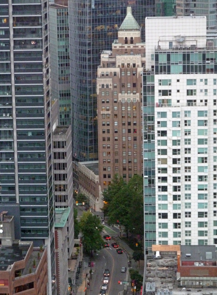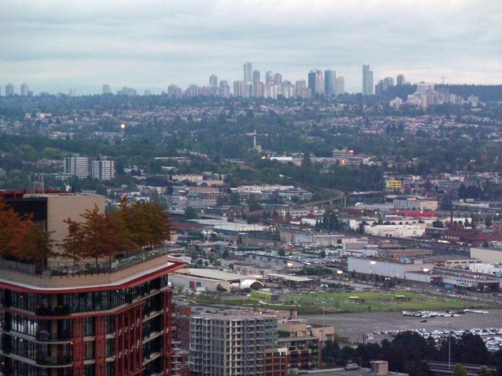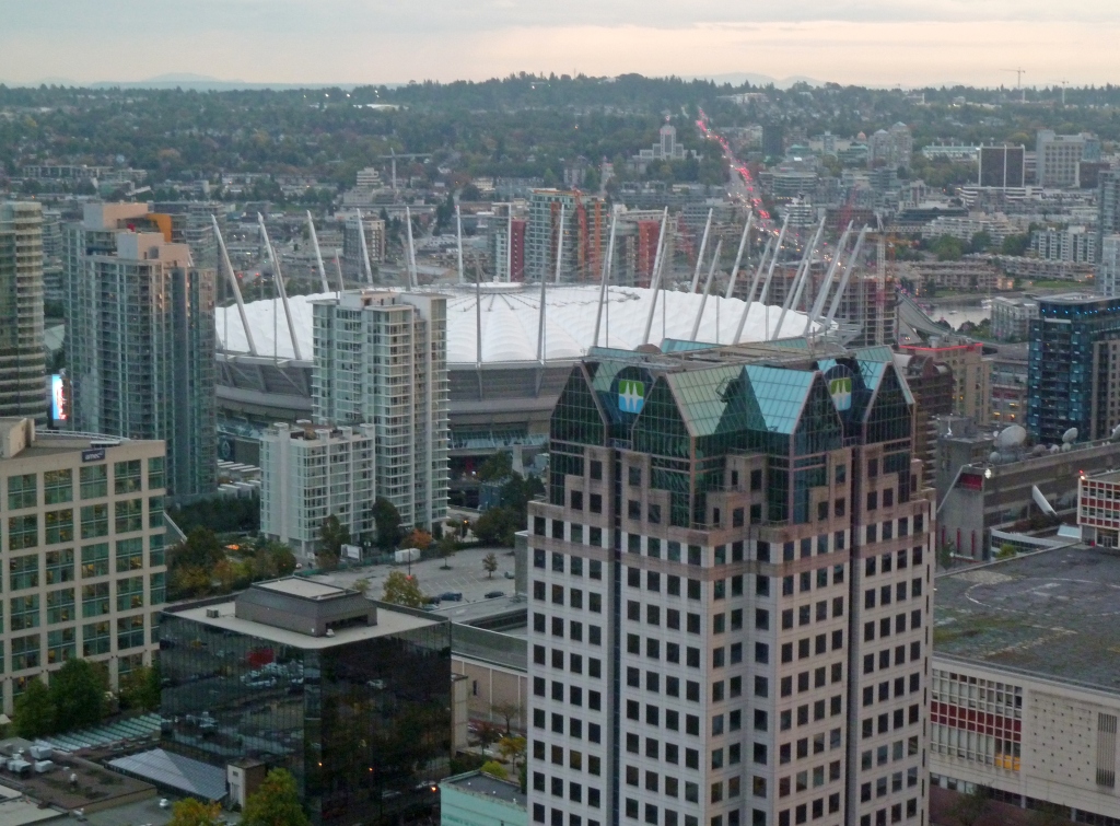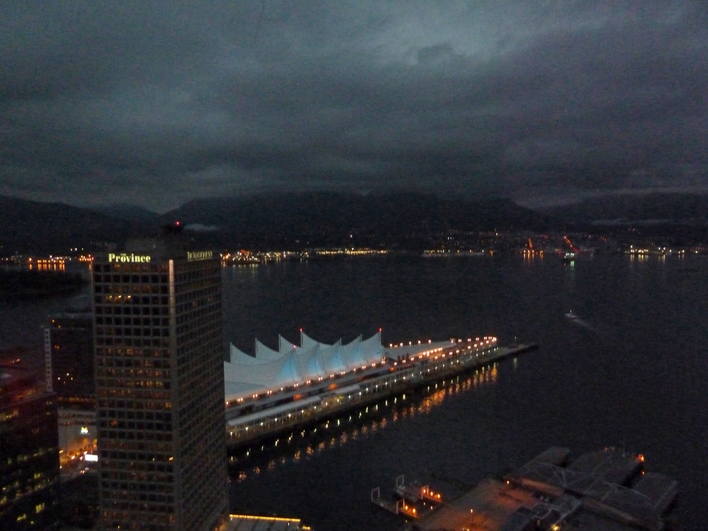 Zum Abschluß des Tages wollen wir zum Vancouver Lookout im Harbor Centre. Wir irren zunächst etwas um den Block herum, bis wir den richtigen Eingang für die Touris entdecken. Es ist wenig Betrieb, so daß wir schnell mit dem Aufzug hochkommen. Oben bleiben wir bis zur Dämmerung und genießen den Blick auf die Stadt.