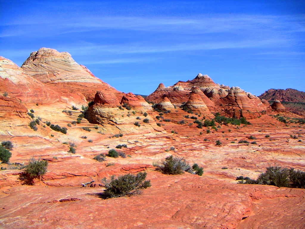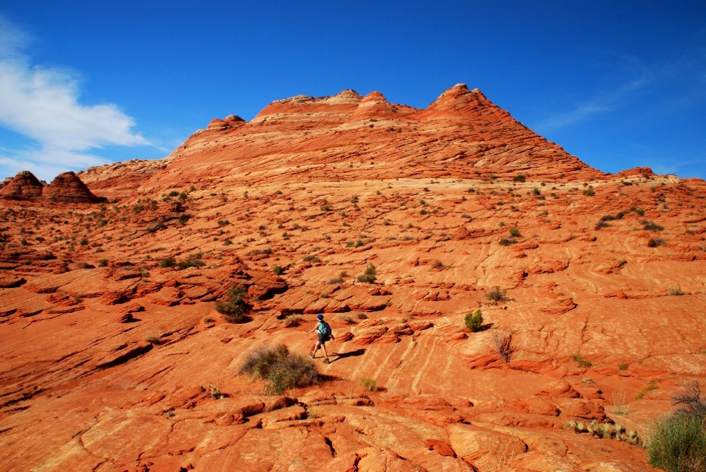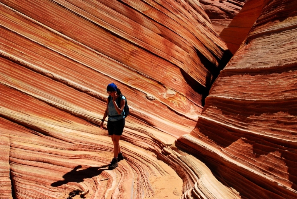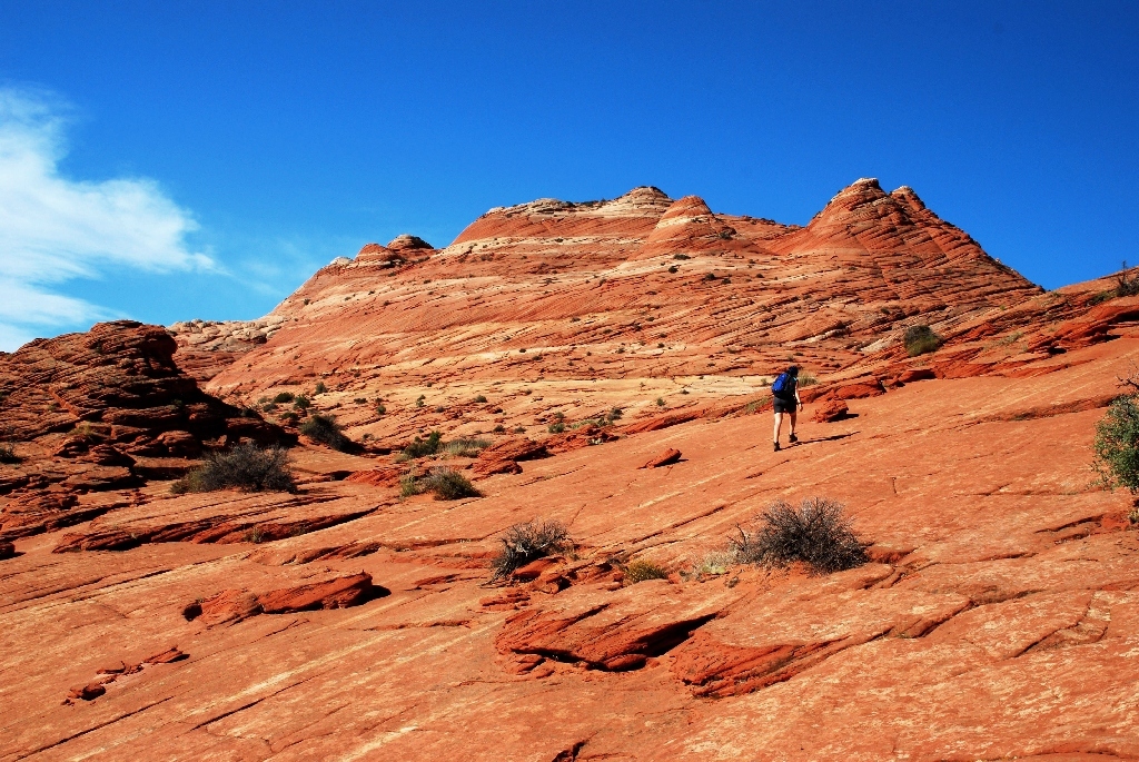 So gegen 09 Uhr ereichten wir den Parkplatz. Beim Aussteigen merken wir, auch hier gibts Mosquitos, die hungrig sind. Und das nicht zu kanpp. Also schnell ins Trailregister eintragen und los gehts. Sobald wir den Coyote Wash verliesen, waren auch die Mosquitos weg. Wir folgten der bebilderten Beschreibung (und den vielen Steinmännchen), die wir in der Contact Station erhielten und genossen den ca. 4,5 km langen Trail zur Wave. Es war mittlerweile heiß und trinken war extrem wichtig. Gut dass jeder von uns 4L Wasser dabei hatte. Die Landschaft war umwerfend schön. Unterwegs trafen wir niemanden. Vielleicht habt Ihr Lust und genießt mit uns ein wenig den Trail?