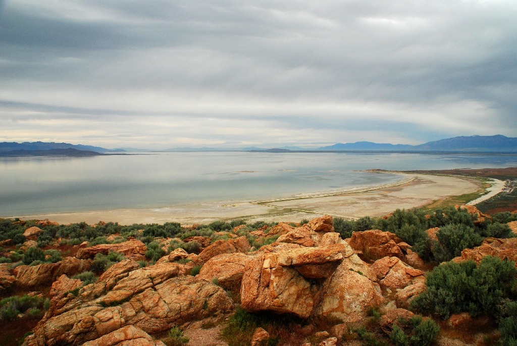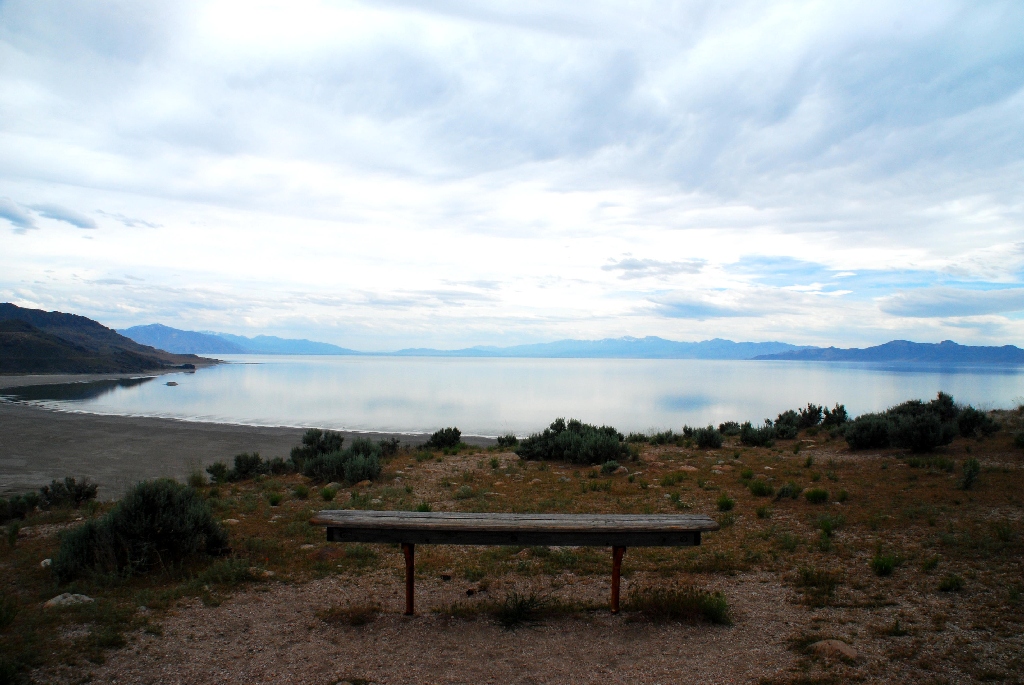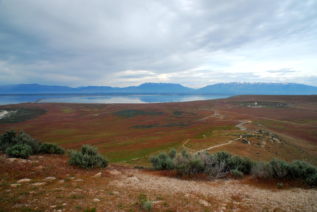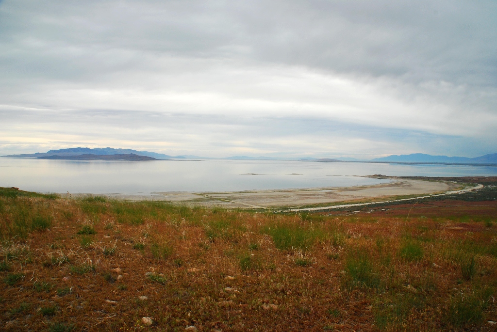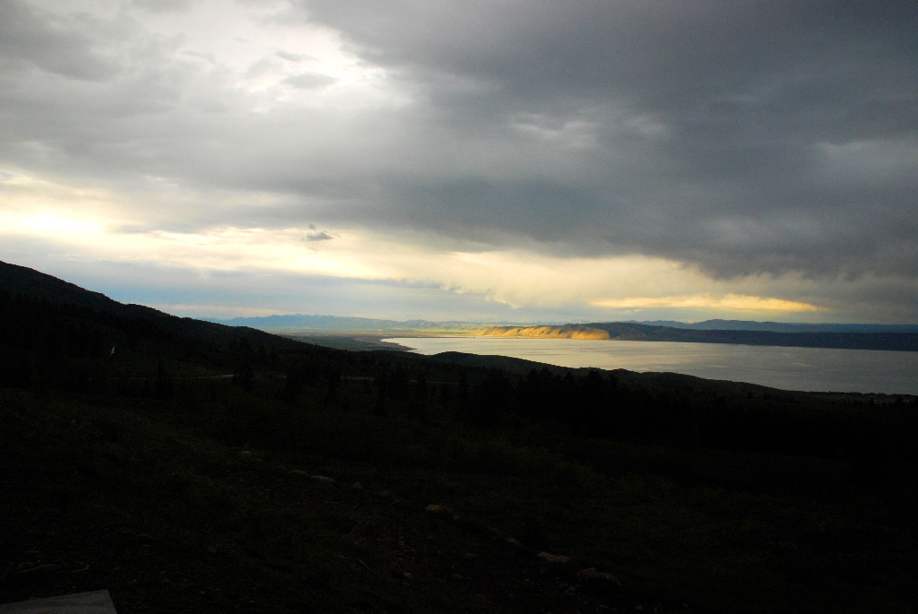 Zurück auf dem I-15 wurde das Wetter schlechter, es zog zu und begann zu regnen.  Bei Brigham City bogen wir wieder auf den altbekannten Highway 89 ab, der uns auch in Zukunft noch häufig begleiten wird. Wir kauften uns daher auch das sehr interessante Buch von Anne Torrence über den Highway 89. In Brigham gab es erstmal Abendessen, Sandwich und Salat bei Subway. Es war jetzt 18 Uhr und wir beschlossen noch bis zum Bear Lake zu fahren. Laut unserer Karte und Infobroschüren gab es dort viele kleinere Ortschaften mit Unterkünften. In Logan ging es durch den Logan Canyon. Eine landschaftlich sehr reizvolle Ecke mit viel Wald und Flüssen, allerdings sehr kurvig, so dass wir nur sehr langsam vorankamen und für die knapp 40 Meilen fast 1 ½ Stunden benötigten. Am Bear Lake Overlook hat man einen tollen Überlick auf den 30km langen und 13km breiten See.