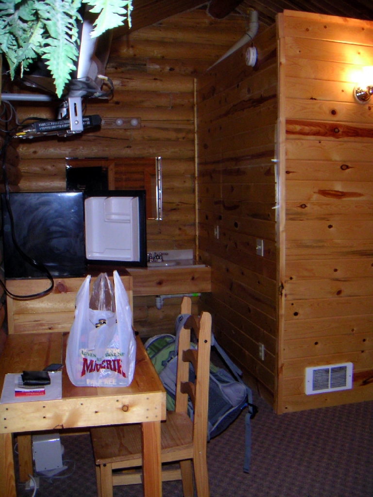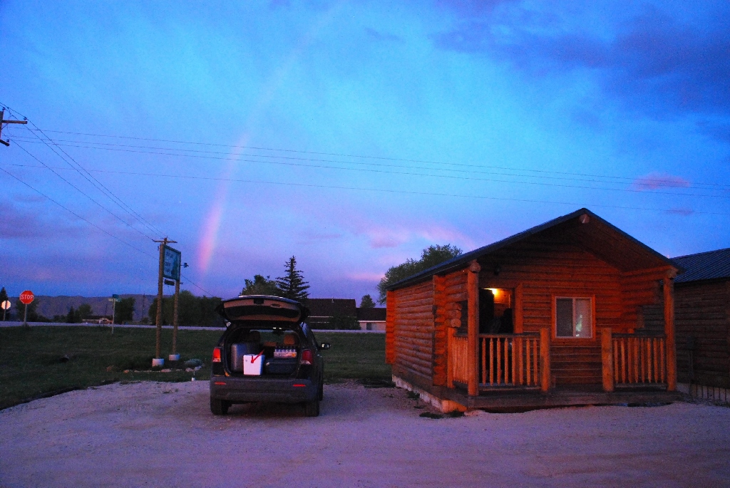 Es war jetzt mittlerweile sehr kalt und regnete. Also nichts wie runter an den See, nach Garden City und eine kuschelige Unterkunft suchen. Im Ort angekommen fanden wir auch gleich 3 B&B´s, die aber noch alle geschlossen hatten. Mist. Hotels sahen wir auf den ersten Blick nicht.  Also erstmal eine Tankstelle angesteuert. Wir fragen bei dem kauzigen Tankstellen-Typen ohne Zähne nach. „ Hotels hmmmmm, Motels hmmmm, I don´t know, hmmmmm. Kathy they are looking for a Hotel/Motel?” Kathy, die ca. 3m neben ihm steht: “What?“ Kauziger Mann: „A Hotel  or Motel, where they can sleeeeep tonight”. Kathy:” Hotel, hmmmm.“  Kauziger Mann: „Or a motel“. Kathy: „ Motel hmmmm.  The Bear Lake Motor Lodge is not bad.” Ok da schauen wir mal hin. Echt freakig die Leute an der Tanke, aber dafür haben sie ein echt riesiges Biersortiment. Wir kaufen noch 2 Sixpacks und suchen das Motel. Laut Wegbeschreibung nicht weit weg, nämlich nur ca. 300m schräg gegenüber der Tankstelle. Das Vacancy Schild leuchtete, aber das Zimmer sollte 120$ kosten. Nein danke, da schlafen wir zur Not im Wagen. Wir fahren weiter den Highway 89 Richtung Norden, kommen an einigen B&B´s vorbei, aber auch die sind alle geschlossen – out of season. Mittlerweile ist es nach 21 Uhr und wir passieren die Grenze zu Idaho. 10 Meilen weiter werden wir dann endlich fündig. Bear Lake Country Cabins hat noch eine Cabin für uns frei für 65 $. Das nehmen wir. Beim Einchecken sehen wir noch kurz die Sonne, der Himmel sah aus als ob er brennen würde und direkt über unserer Hütte war ein Regenbogen.