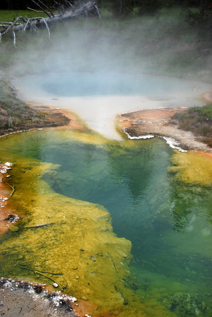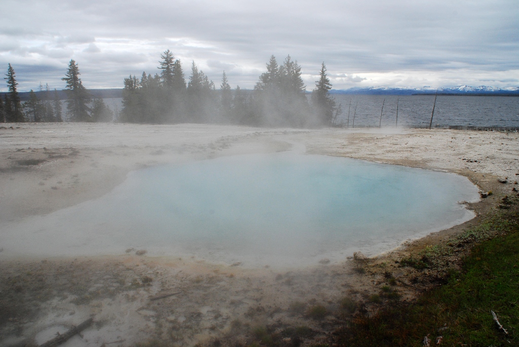 Am Straßenrand die ersten Schneefelder. Wir parkten beim West Thumb Geyir Basin. Es war immer noch stark bewölkt und saukalt. Obwohl wir warm angezogen waren, Fliespullis und darüber Fliesjacken, froren wir. Mit klammen Händen und fröstelnd marschierten wir den outer boardwalk und den inner Loop. Die einzelnen Namen der Geysire, Pools und Springs bringen wir leider nicht mehr auf die Reihe.