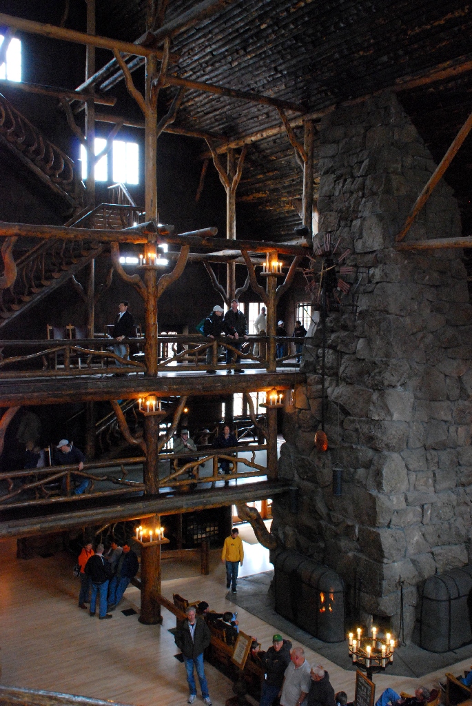 Wir schauten noch in das Old Faithful Inn. Das Hotel wurde 1903 errichtet und ist komplett aus Holz gebaut. Es gilt daher als als weltgrößtes Blockhaus. Ein wirklich sehenswertes Gebäude mit einer beeindruckenden Holzkonstruktion.