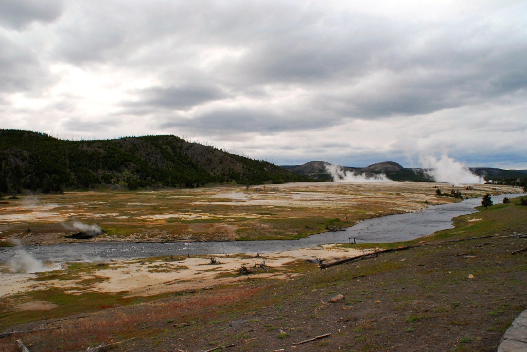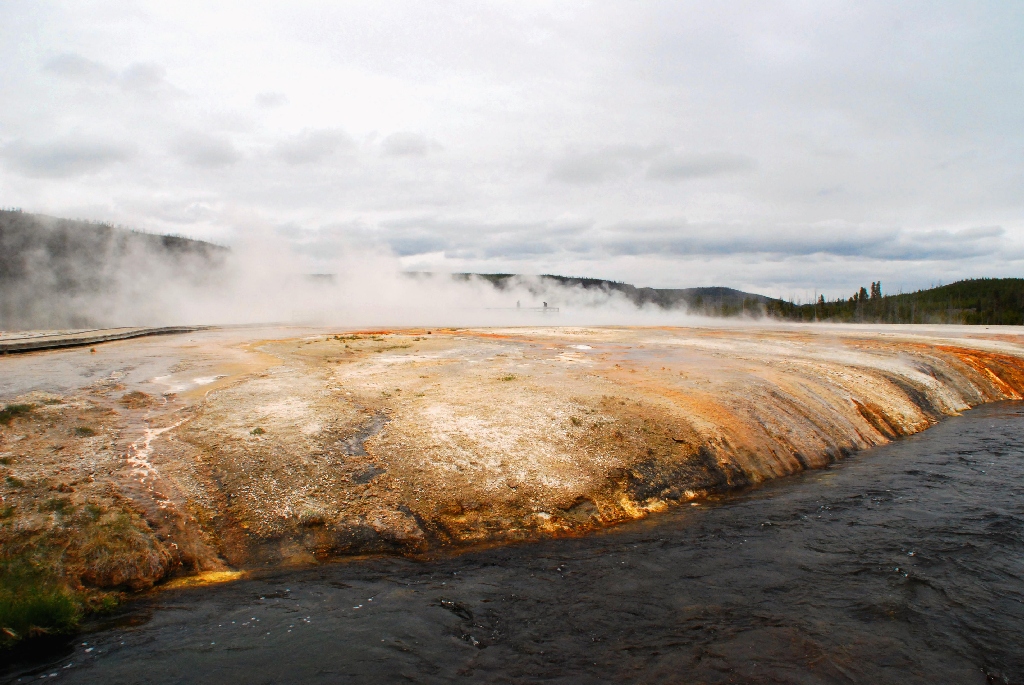 Als nächster Halt stand das Midway Geysir Basin auf dem Programm. Dort befindet sich die Grand Prismatic Spring, der größte Heißwasserpool im Nationalpark mit einem Durchmesser von ca. 110m. Da die Quelle so groß ist, sieht man eigentlich nur eine große dampfende Wasserfläche.