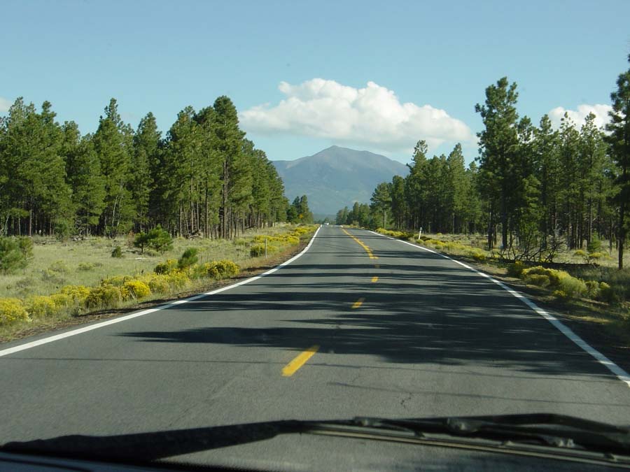 Nach dieser Aufregung fuhren wir nach Flagstaff. Auf dem Weg dorthin kreuzte ein Koyote in gemächlichem Schritt vor uns die Straße. Als er auf der anderen Seite war, blickte er uns nochmals an, als wollte er sagen „Wos is, wos schauts so blöd“. Vor Flagstaff ähnelt die Gegend einer bewaldeten Almlandschaft.