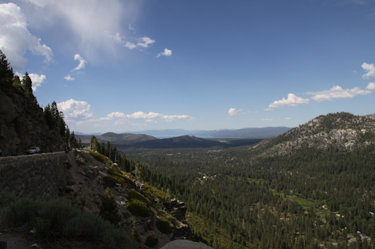 Ab Sacramento wurde die Fahrt dann spannender. Durch riesige Wälder und über Pässe ging es in Richtung Lake Tahoe. Die Strasse windet sich zum Echo Summit herauf, welcher auf 7382 Feet Höhe liegt. Immer wieder kommen Warnschilder, dass im Winter Schneeketten nötig sind. Jetzt im November wird es dort oben bestimmt schon ganz anders aussehen. Die Fahrt ist atemberaubend, vor allem als sich vor uns plötzlich das Tal mit gigantischem Blick auf den Lake Tahoe öffnete.