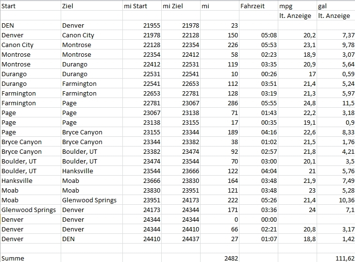 Die Strecken sind einschließlich aller Umwege und Einkaufsfahrten zum Supermarkt etc vom Kilometerzähler jeden Abend abgelesen. Die Fahrzeit sowie Verbrauchswerte sind vom Bordcomputer abgelesen. Die aufgrund der Tankmengen berechneten Verbrauchswerte (s.u.) liegen einen Tick höher, als es der BC glauben machen will. Das Maximum an Fahrtstrecke lag bei 286 mi und war eigentlich eine Art Transferfahrt und bequem zu bewältigen. Ansonsten waren die Strecken für den Südwesten sehr moderat bemessen.