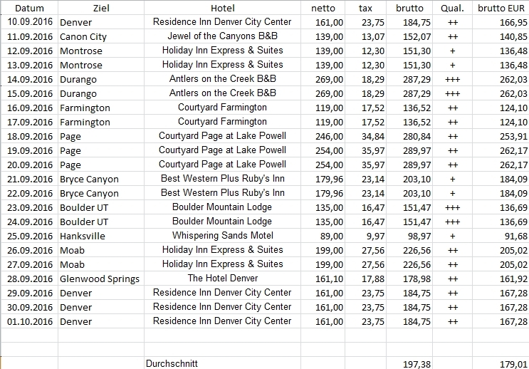 Im Durchschnitt haben wir etwa gleich teuer wie 2014 im Südwesten übernachtet, was mir seinerzeit ziemlich teuer vorkam. Inzwischen ist da wohl eine Art Gewöhnungseffekt eingetreten. Überteuert erscheinen Moab und Page (in Page müßte man in der zweiten Oktoberhälfte hin, da kostet es plötzlich weniger als die Hälfte), enorm günstig im Preis/Leistungsverhältnis ist die Boulder Mountain Lodge.