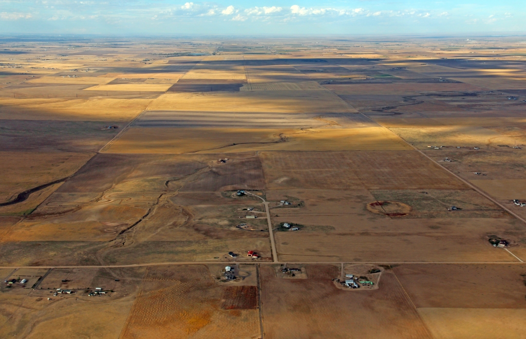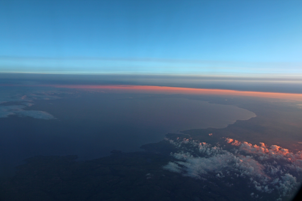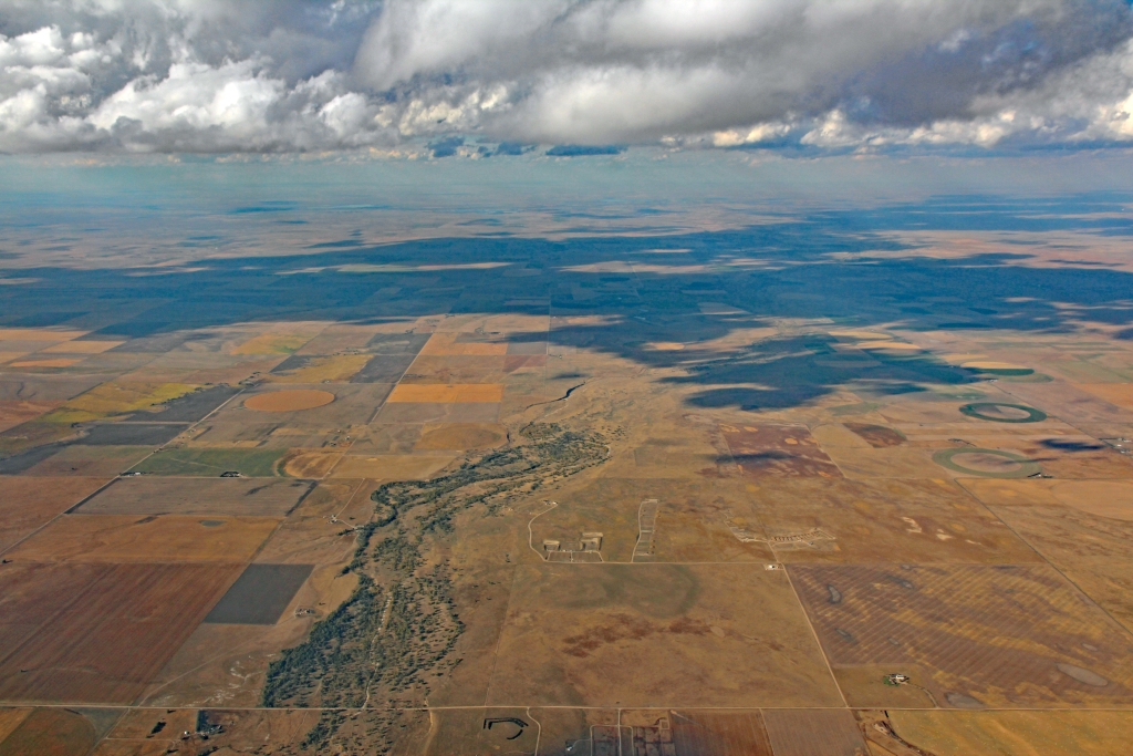Nachdem sich alle in der Maschine einsortiert haben, verläuft der Start unspektakulär – wir fliegen unmittelbar nach Westen hinaus über die platte Prärie. Dann sind ein paar dicke Wolkenfelder zu durchqueren, bevor wieder Sicht nach unten herrscht und der Bordservice beginnt.