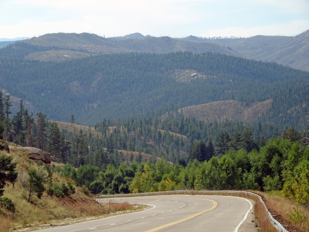 Nach einem Blick auf die Landkarte und auf die Uhr entscheiden wir uns, über die als landschaftlich schön markierte Strecke über Hauptstraßen zu fahren und nicht auf den Nebenstrecken durch den Wald, zumal die Zeit für den Devils Head ohnehin zu knapp würde. So fahren wir durch wirklich schöne Täler und Hügel mit Ausblicken, Kiefernwäldern (mal grün, mal verbrannt) und Bächen bis Victor.