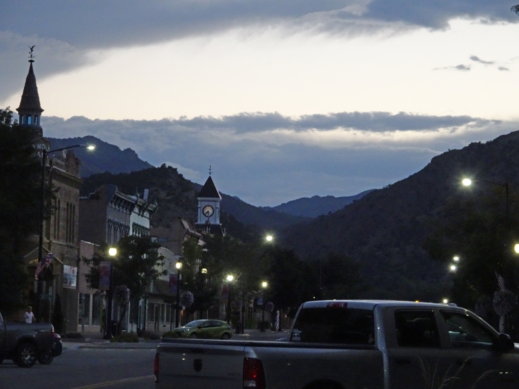 Nach einer kurzen Pause auf der Veranda gehen wir in Richtung Hauptstraße. Cañon City genießt wegen seiner 12 Gefängnisse den Ruf als "Prison Capital". Außerdem ist es Ausgangspunkt für Besuche der Royal Gorge Bridge und -Railway. Von alldem merkt man aber sonntags wenig, der Ort ist tote Hose. Wie ich schon zuhause bei Internet-Recherchen festgestellt habe, haben alle ordentlichen Lokale hier am Sonntag geschlossen. So suchen wir auf Empfehlung der Innkeeperin die Pizza Madness auf – einen ganz witzigen Schuppen, den wir ansonsten aber wohl nicht betreten hätten.  Wir lassen und eine vegetarische Pizza und eine mit Salami und Bacon mischen auf Thin Crust – und das ganze gerät auch recht gelungen. Mit je zwei Bier dazu werden wir gut gesättigt und stapfen bei fast gewittriger Abendstimmung müde ins B&B zurück mit den üblichen Abschlußveranstaltungen.