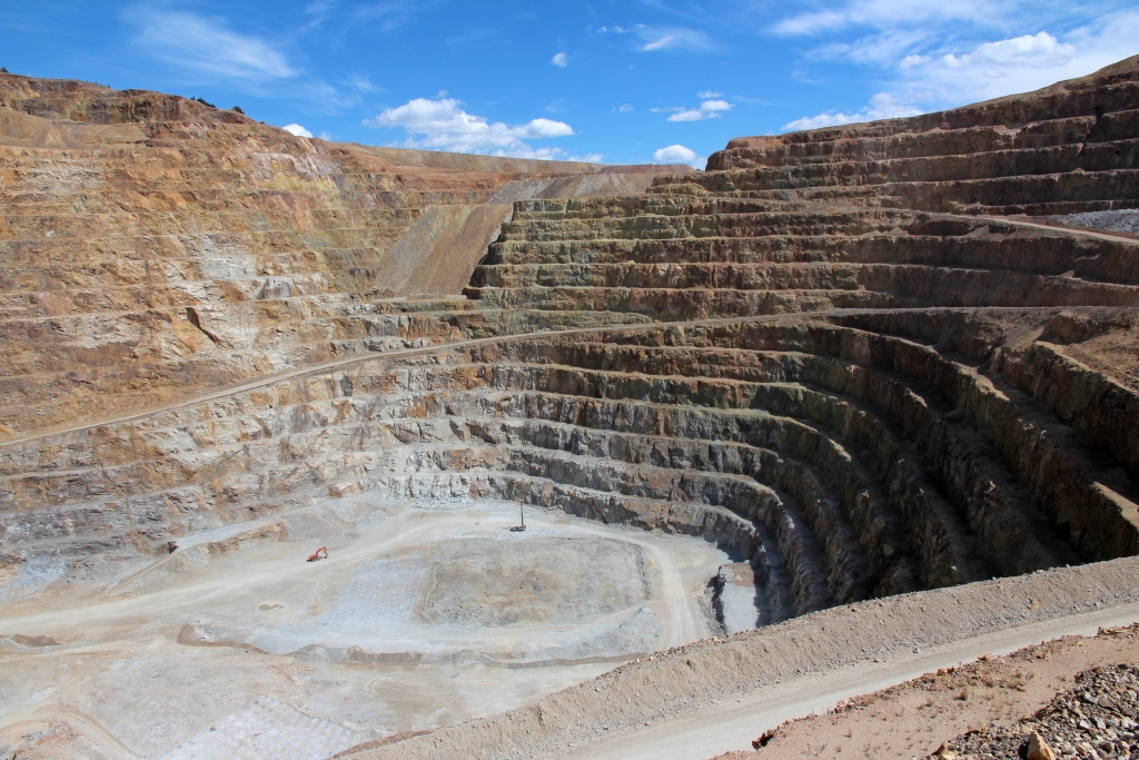 Die spielzeuggroß wirkenden Bagger unten verdeutlichen die Dimensionen; oben links am Rand sieht man alte Minenanlagen