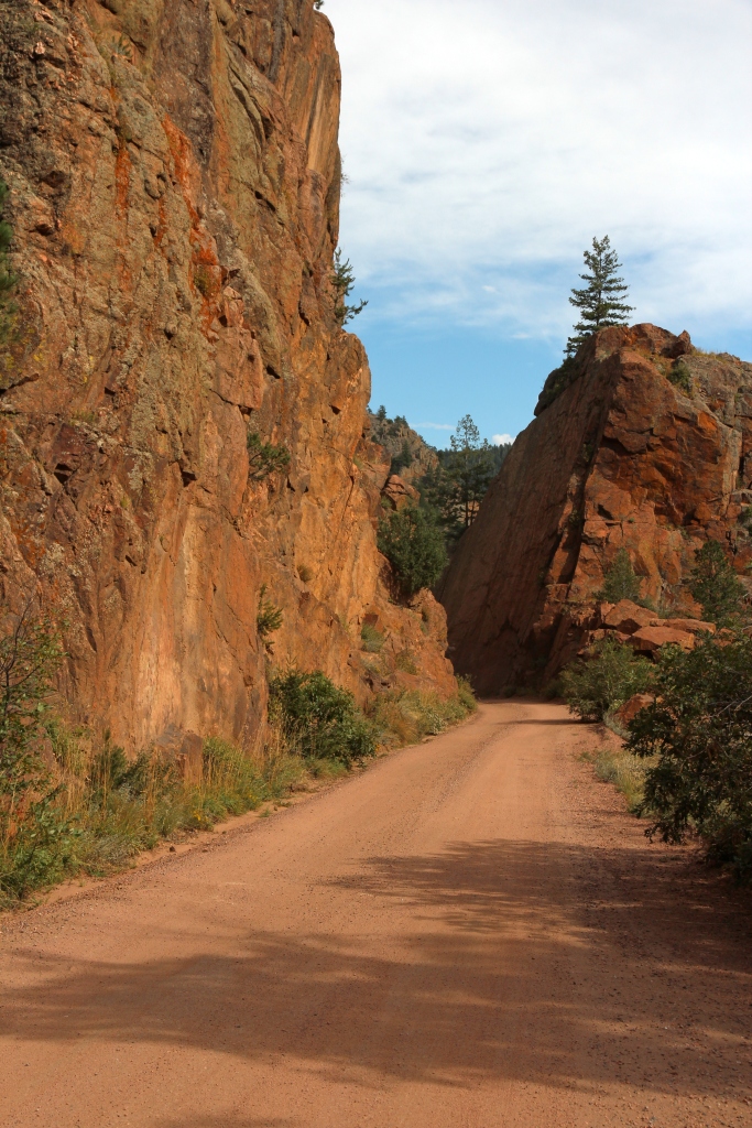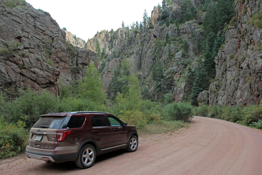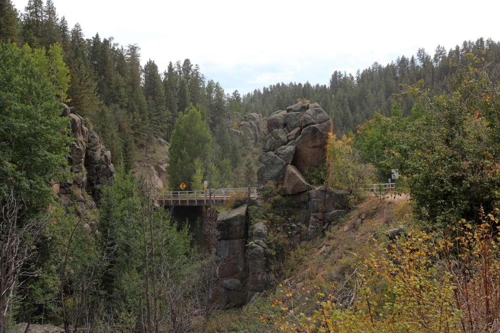 Nach der Rückkehr nach Victor fahren wir zur hier beginnenden Phantom Canyon Road. Diese Straße führt auf einer ehemaligen Eisenbahntrasse durch einen schönen Canyon. Zum Teil verläuft sie einspurig mit ziemlichen Abbrüchen am rechten Rand, die bei Marianne beinahe Panik auslösen. Trotzdem ist die Straße für mein Gefühl weit weniger spektakulär als viele Beschreibungen glauben machen. Da gibt es in den Alpen (und auch in den USA) aufregenderes. Insgesamt ist die Straße eigentlich gut zu fahren, nur im unteren Teil ist das Washboard stellenweise ziemlich ausgeprägt. Anders als in vielen Berichten zu lesen, ist man heute am Sonntag aber nicht alleine unterwegs, sondern es herrscht ziemlich viel Verkehr. Mein persönliches Fazit im "Michelin-Führer-Stil": einen Umweg wert (aber nicht: eine Reise wert).