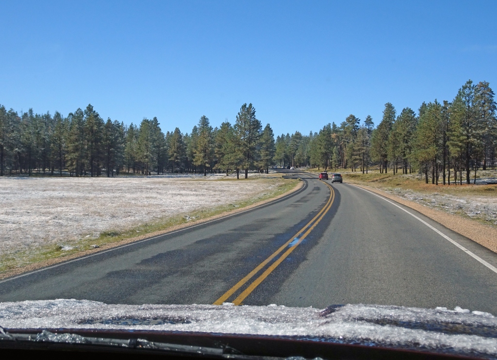 UT 60 im Bryce Canyon mit Schneeresten auf den Wiesen