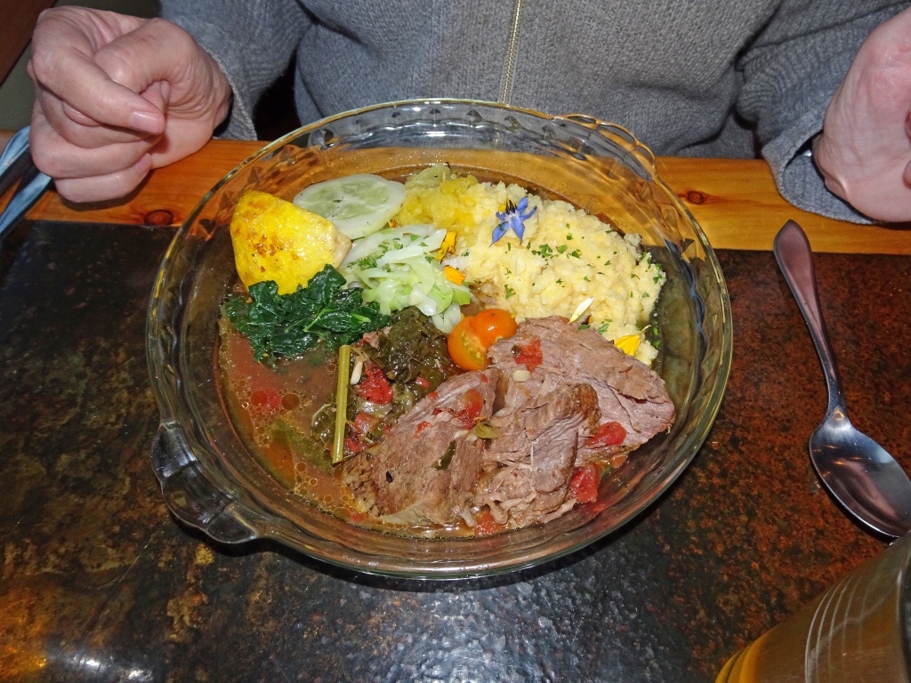 Bei Marianne macht sich zunehmend eine Erkältung breit, außerdem sind wir müde und hungrig. Beim Rausfahren auf die US 6 entdeckt Marianne ein Brewhouse, wohin wir einen Abstecher unternehmen, um zu einem guten Bier eine Zwiebesluppe (Marianne) bzw. einen Salat (ich) zu uns zu nehmen.