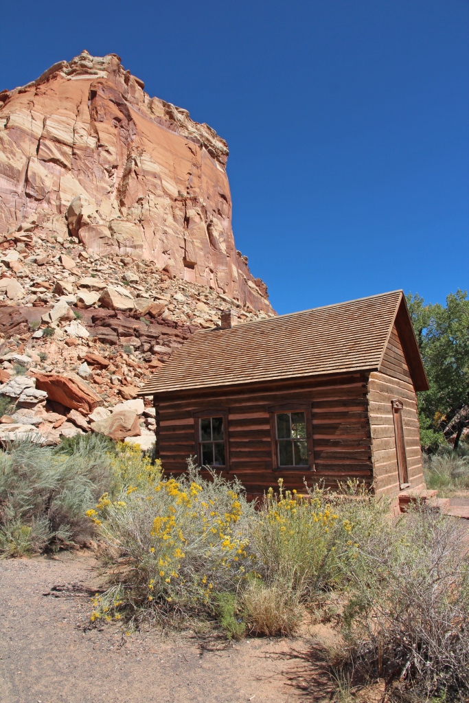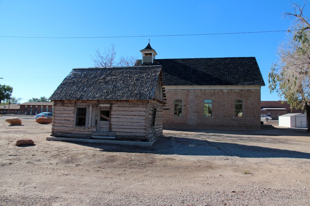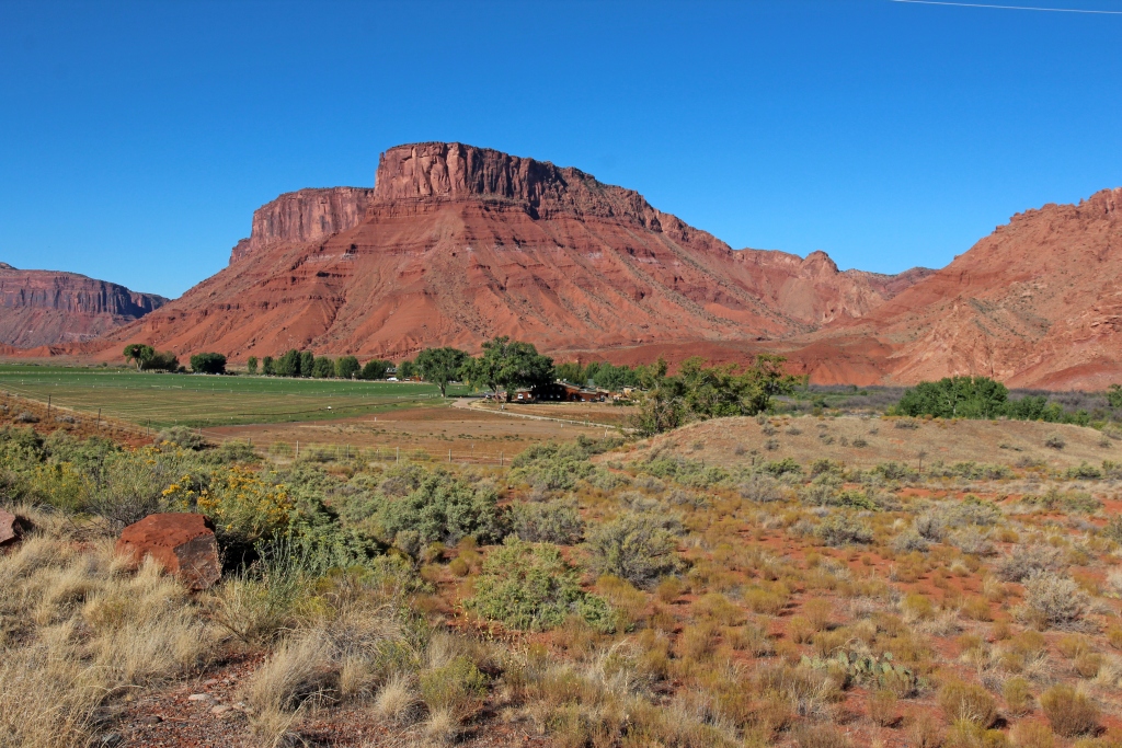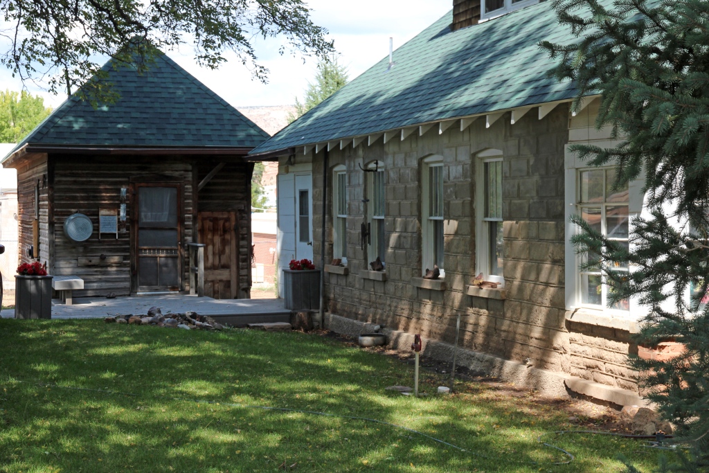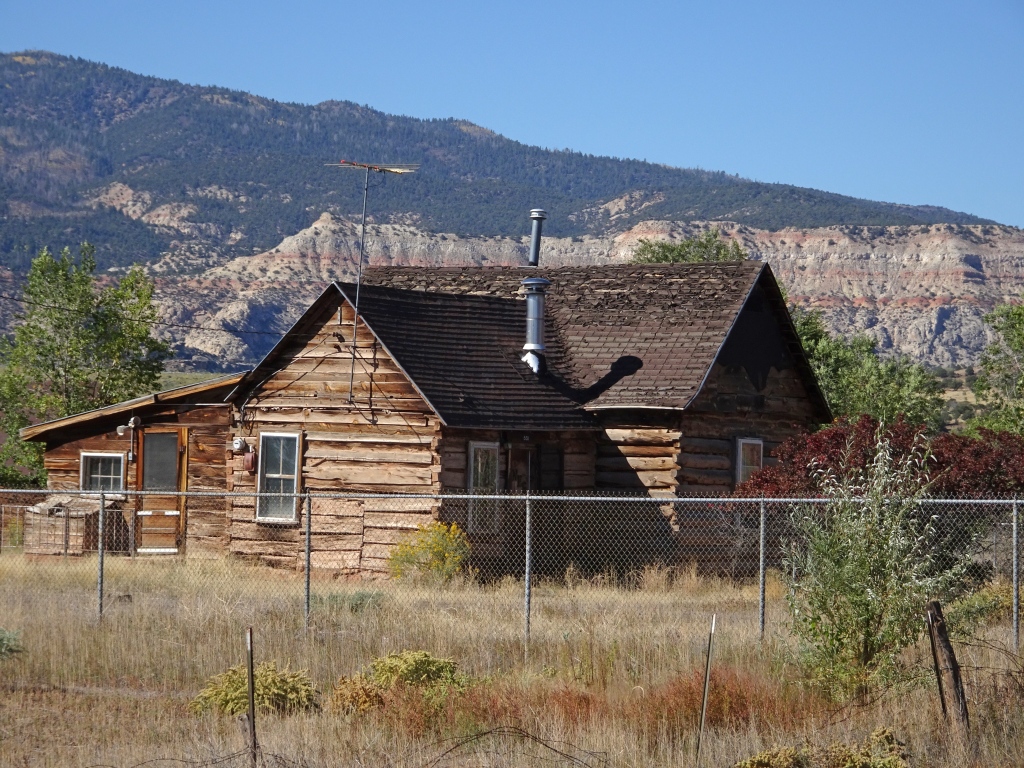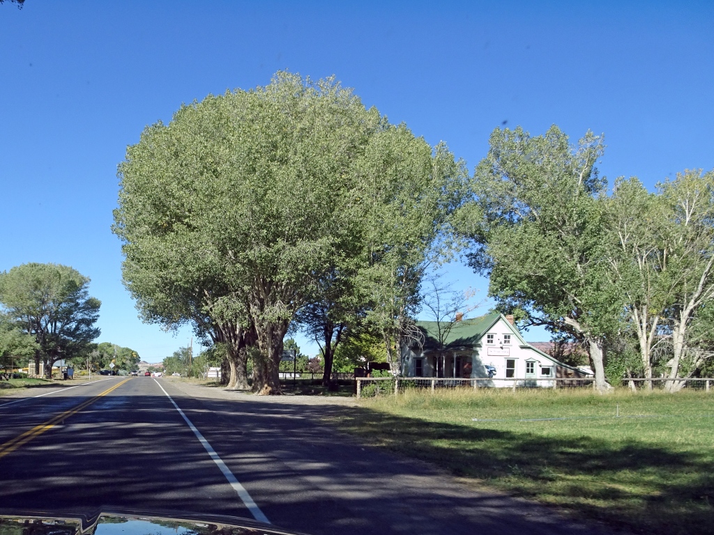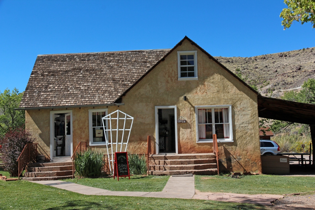Wir gehen noch ein wenig umher und entdecken dann im schön hergerichteten ehemaligen Peoples Exchange Gebäude noch eine Ausstellung mit besonders schönen hochwertigen Quilts, die aber nicht zum Verkauf stehen (und wohl auch unerschwinglich wären). Dort nehmen wir noch einen Stadtplan mit Liste der historischen Gebäude mit, anhand dessen wir noch ein wenig in Escalante herumlaufen und -fahren. Bevor wir zum Auto kommen, nehmen wir aus einer Kiste, die zu diesem Zwecke am Straßenrand steht, noch zwei Birnen mit.
