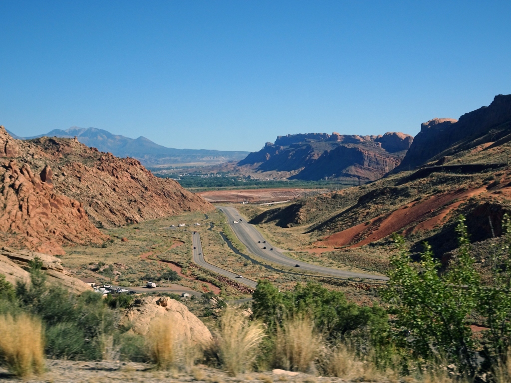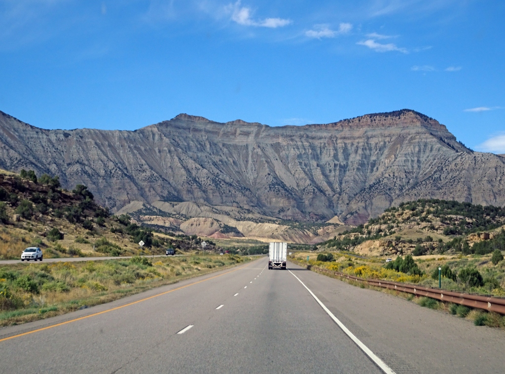 In Grand Junction stoßen wir auf eine deviation wegen sholder work, die in einer deviation endet, die genau in Gegenrichtung zeigt. Also fahren wir zurück, scheren uns nicht um das ursprüngliche deviation-Schild und kommen auch ganz ohne Behinderung durch. Auf der Interstate machen wir in Parachute einen kurzen Stop, um das verschwitzte Hemd zu wechseln und die Postkarte an Lara einzuwerfen.