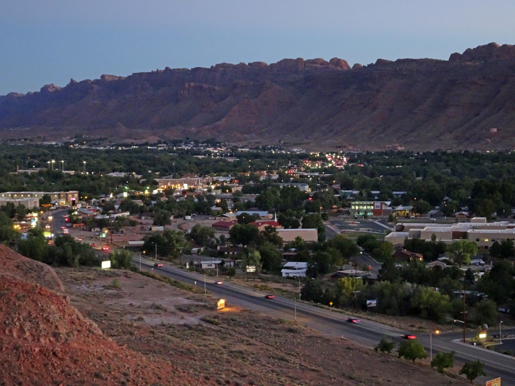 Dann geht es aber schnurstracks zurück nach Moab. Am Ortseingang machen wir noch einen Fotostop, um die Gondelbahn aufzunehmen, die dort seit 2001 steht und nie zahlende Gäste befördert hat. Dann aber ab ins Hotel, wo wir uns für das Abendessen frisch machen. Wir suchen das zweite Restaurant, bei dem wir vor einigen Jahren sehr zufrieden waren. Unter dem Namen Desert Grill finden wir in der Ortsmitte einen etwas verschlossen wirkenden Laden – das kann es nicht gewesen sein. Wir lassen unseren Ortssinn wirken und finden das Haus nicht weit von unserem Hotel – es ist aber kein Restaurant mehr.