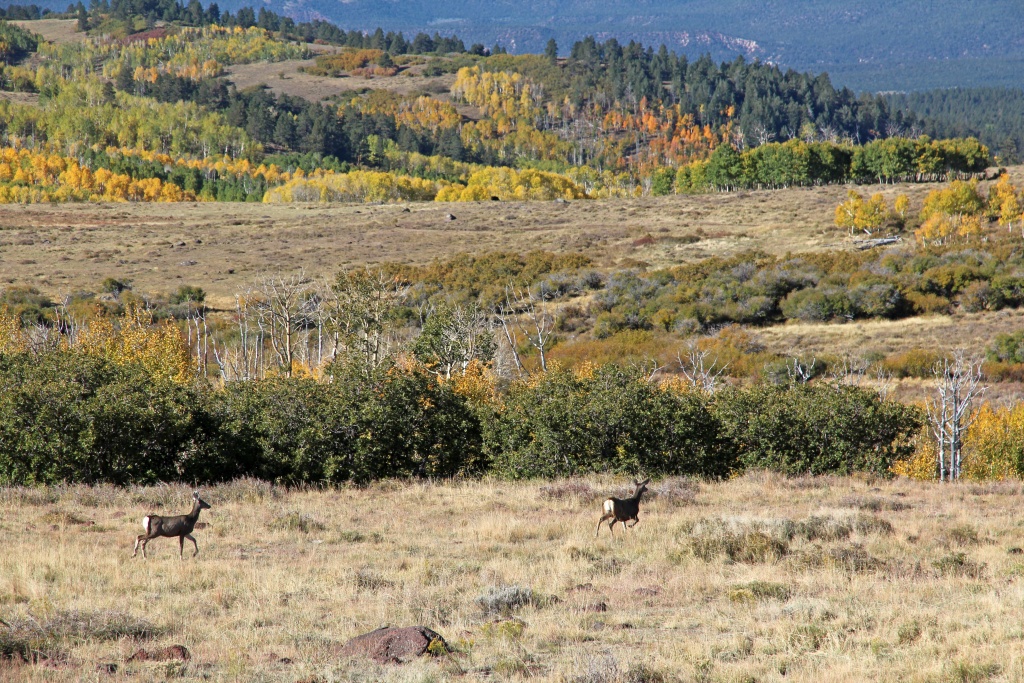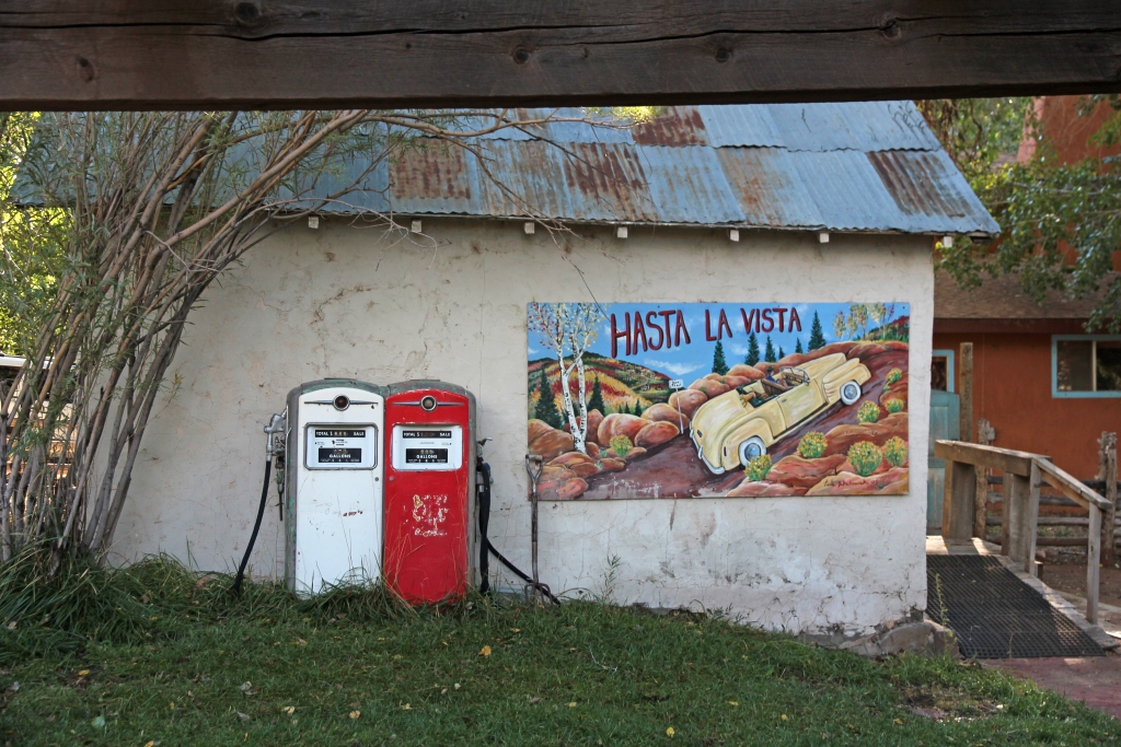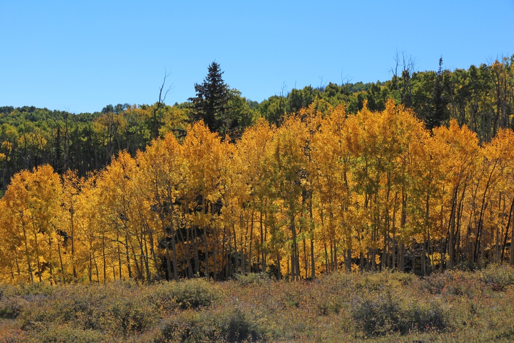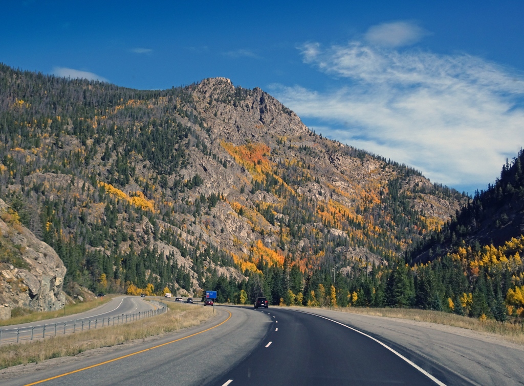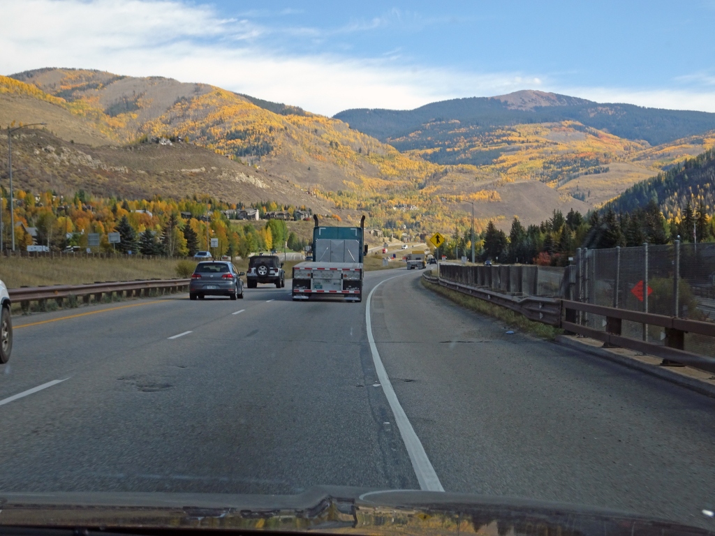 Wir fahren zügig in Richtung Osten ins Hochgebirge hinein, erst durch felsige Schluchten, dann durch Hochebenen mit wunderschönen gefärbten Bäumen. Unterwegs machen wir Halt an einer Rest Area in der Nähe von Beaver Creek. Dort gibt es dann auch noch einen Schluck aus der Tankstelle für unser Auto – eine teure Veranstaltung.