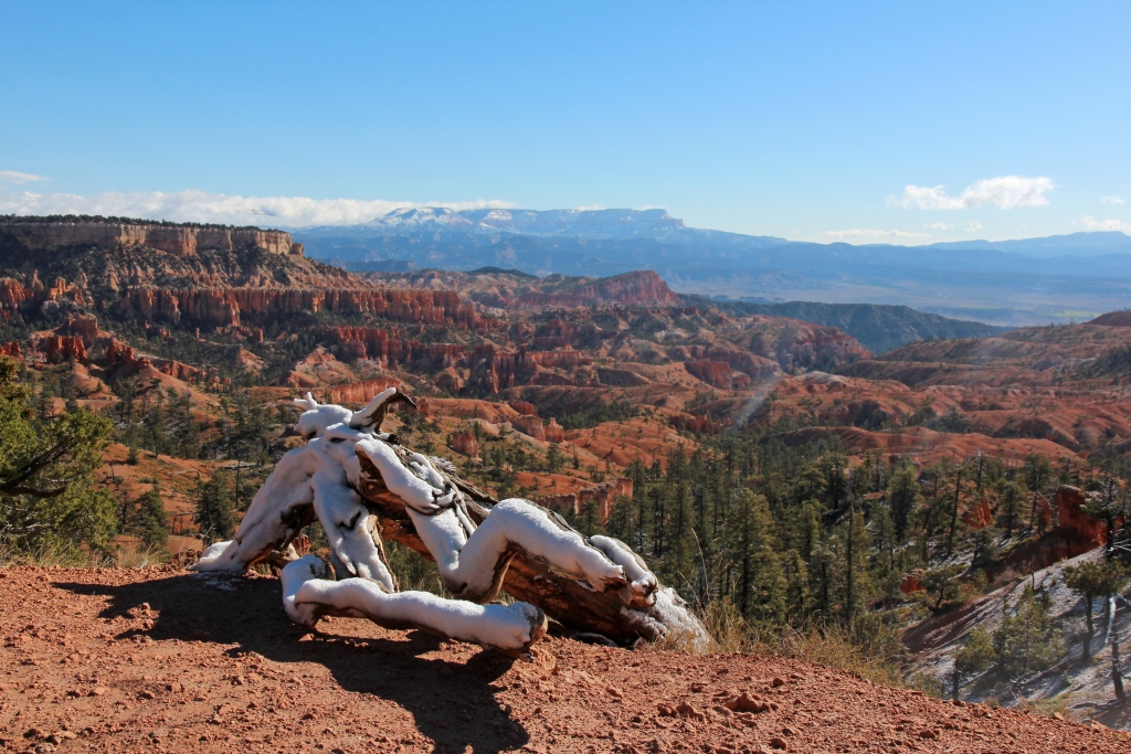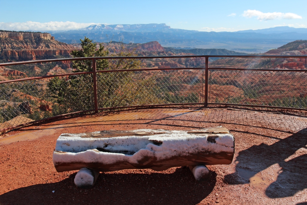 Während auf der Ebene zwischen den Bäumen noch etwas Schnee lag, ist er auf den roten Steinen aber schon weggeschmolzen. Nur an manchen Schildern und Bänken hat sich vom Wind festgepreßter Schnee gehalten. Dafür ist die Luft schön klar und wir genießen die Aussicht. Nach einem letzten Blick im Park auf den Bryce Canyon machen wir uns auf den Weg in Richtung Escalante.