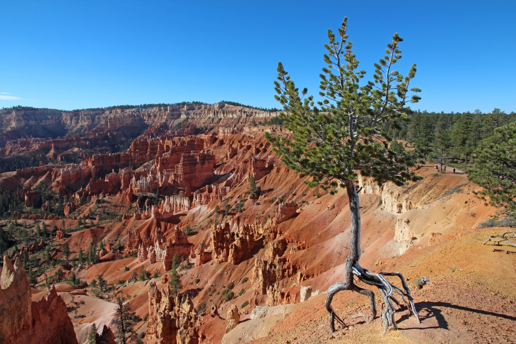 Daraus wird allerdings nichts. Schon an der Abzweigung zum Inspiration Point ist die Straße gesperrt. Ein Ranger erklärt, daß in etwa einer Stunde geöffnet werde. Man soll zurück zum Visitor Center fahren, dort nach rechts abbiegen und den großen Parkplatz nutzen und "jump on the shuttle". Das machen wir natürlich nicht – d.h. nur zum Teil, weil wir ja heute noch weiter wollen. Wir fahren zurück und biegen rechts ab – zunächst beim Sunset Point, wo aber der Parkplatz schon überfüllt ist, dann in Richtung Lodge, wo wir in Richtung Sunrise Point einen Parkplatz finden und losmarschieren.