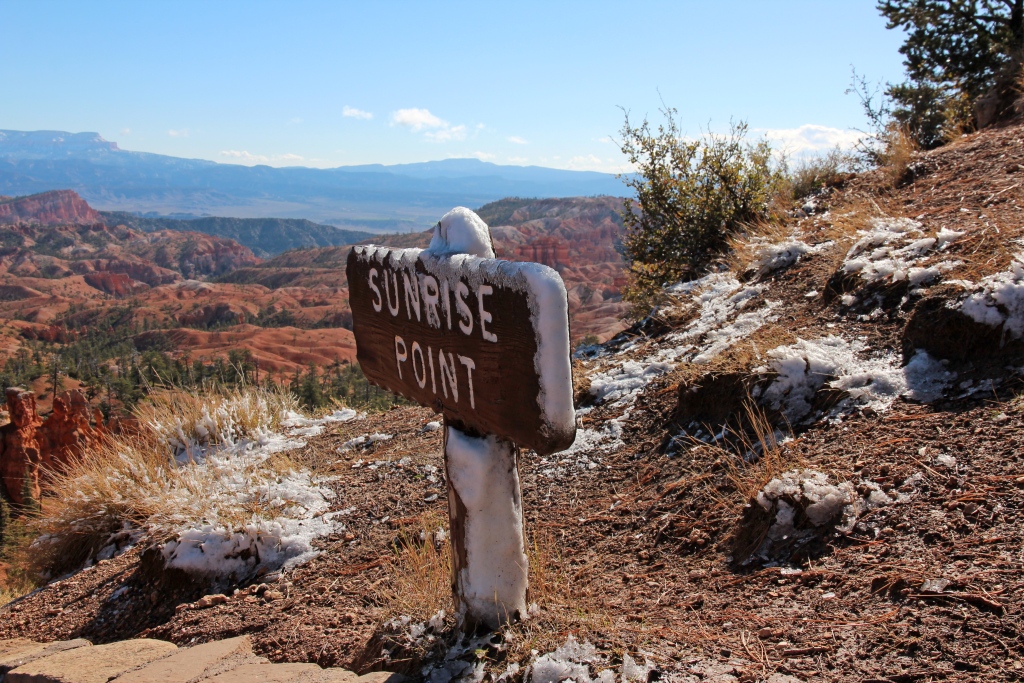 Wir frühstücken auf dem Zimmer mit Banane und Joghurt. Die Sonne scheint und wir beladen das Auto bei 0° C. Das schöne Wetter veranlaßt uns, nochmals in den Bryce Canyon NP zu fahren – vielleicht sehen wir ja noch ein paar Hoodoos mit Schnee drauf.