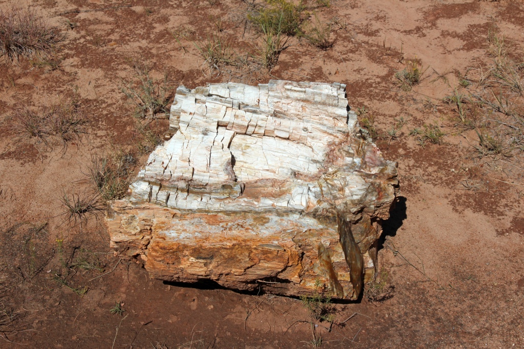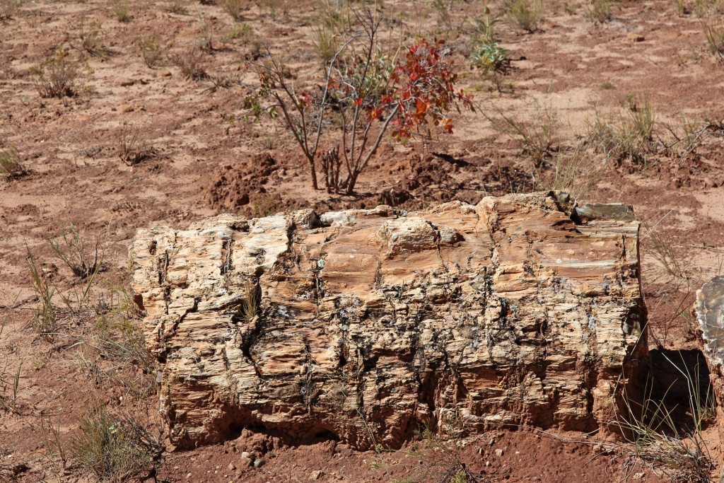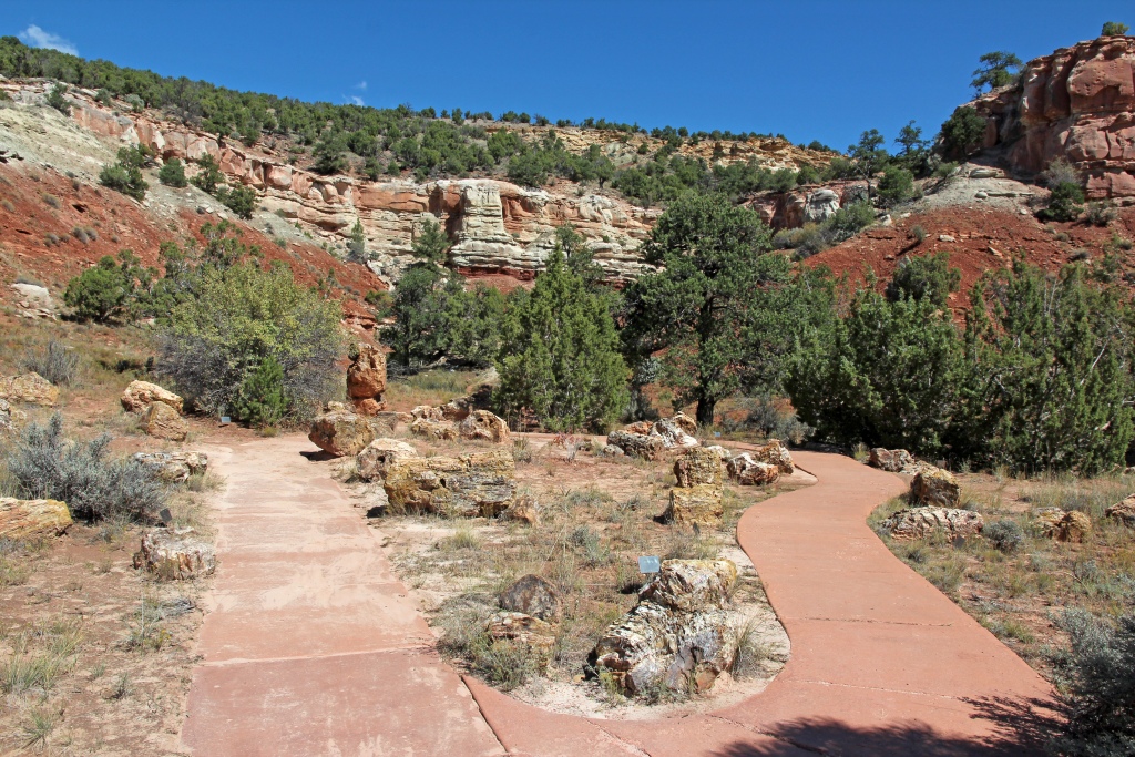 Da alle Ausflüge außerhalb der befestigten Straßen tabu sind (und bei den Lower Calf Creek Falls waren wir schon zweimal), fahren wir zum Escalante Petrified Forest SP. Dort erzählt uns die Tante am Eingang, daß es einen anstrengenden Weg in witterungsbedingt ziemlich schlechtem Zustand für 8 USD oder einen einfachen "Cove" für 4 USD gebe. Vorsichtig wie wir sind, entscheiden wir uns für die sichere Seite. Die allerdings entpuppt sich als eine 25 Meter kurze Runde mit einigen Stücken versteinertem Holz. Haken wir halt die 4 USD pro Person als großzügige Spende für einen guten Zweck ab.