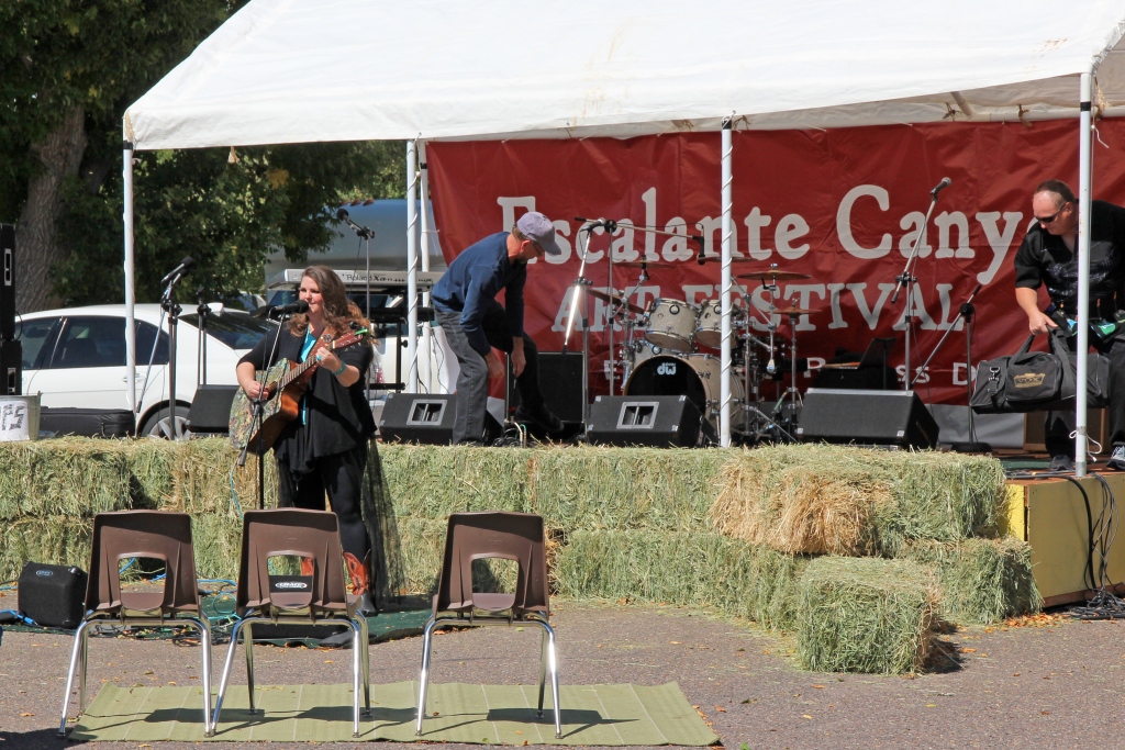 Enttäuscht fahren wir zurück nach Escalante, um das dortige Art Festival aufzusuchen. Wir parken in einer Nebenstraße mit hübschen älteren Häuschen und Gärten. In der Center Street singt und jodelt ein Mädchen vor ein wenig Publikum und es gibt etliche Stände mit kunsthandwerklichen Stücken von Schmuck über Bilder bis zu Duftölen. In der Turnhalle der Schule entdecken wir einige ganz nette handgemachte kleine Quilts und kaufen gleich zwei davon mit Pioneer Girls für die Enkelinnen. Die Näherin fällt uns nahezu um den Hals.