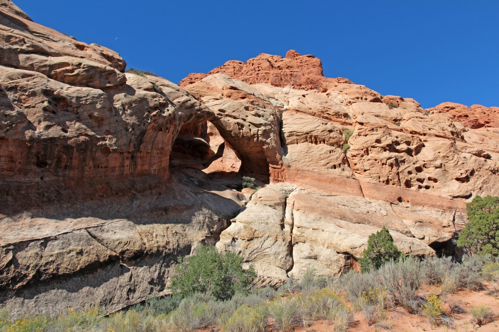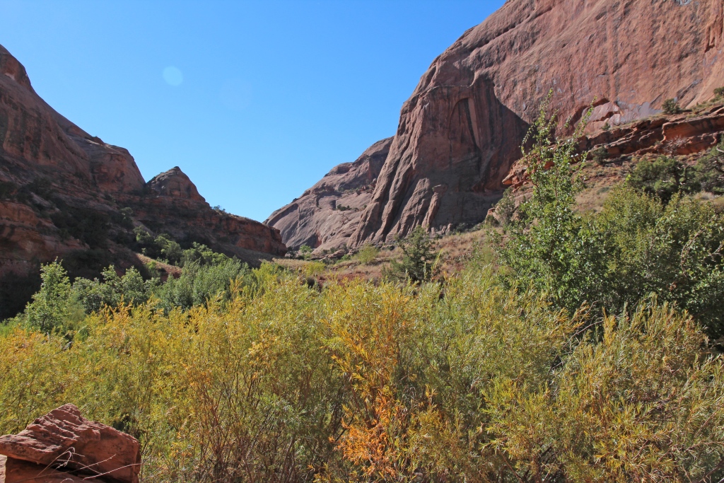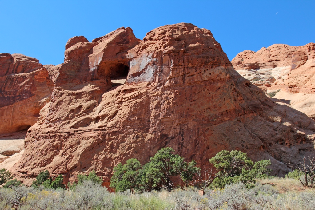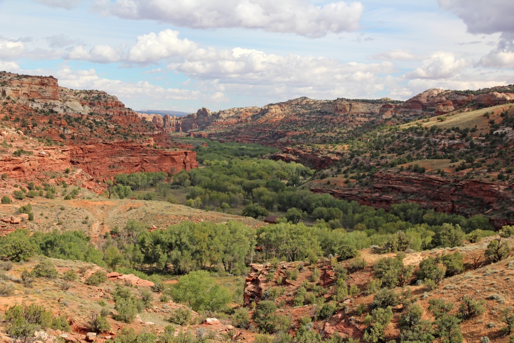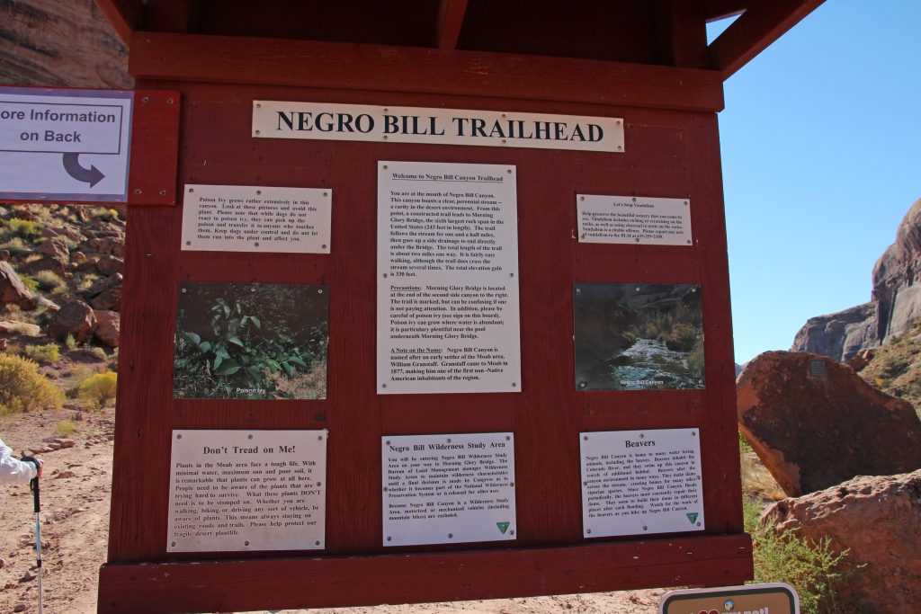 Wir fahren als erstes in den Ort zum City Market, um Wasser und Bier zu kaufen. Ein paar Joghurts müssen es auch noch sein. Zunächst steht die Morning Glory Bridge auf dem Programm. Daher geht es Richtung Norden und auf die UT 128. Am richtigen Parkplatz fahren wir erst vorbei, weil in keiner Beschreibung steht, daß es sich um den Granstaff Trailhead handelt. Auf dem Rückweg biegen wir auf gut Glück ein, weil die Entfernung in etwa stimmt und siehe da, wir sind richtig. Wir sind am Negro Bill Canyon, der wirklich und immer noch so heißt, obwohl es 2012 eine Initiative zur politisch korrekten Umbenamsung gab (eine erste gab es schon, bis in die 60er hieß er „Nigger Bill Canyon“). Nur eben an der Beschilderung an der Straße wurde der Namenswechsel zu Granstaff Trail vollzogen.
