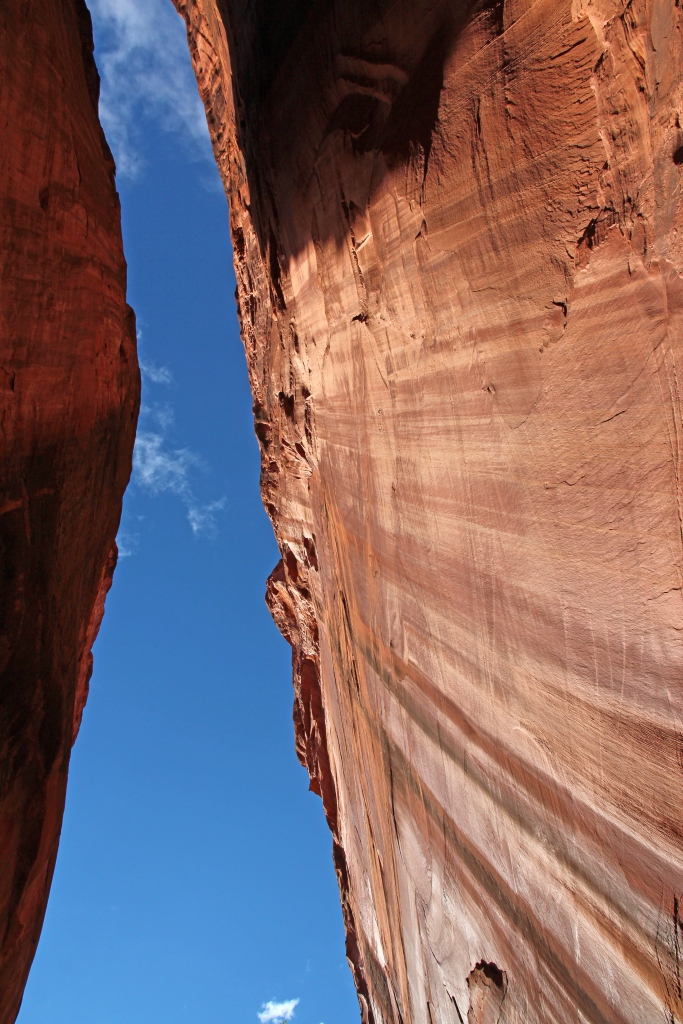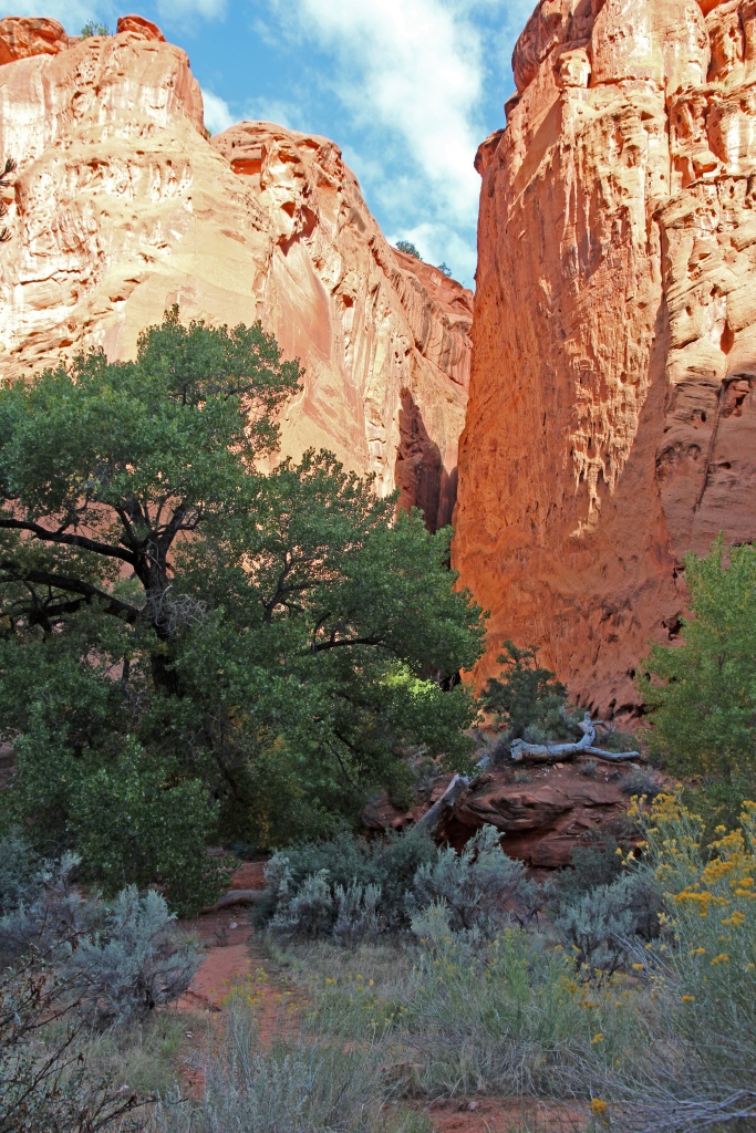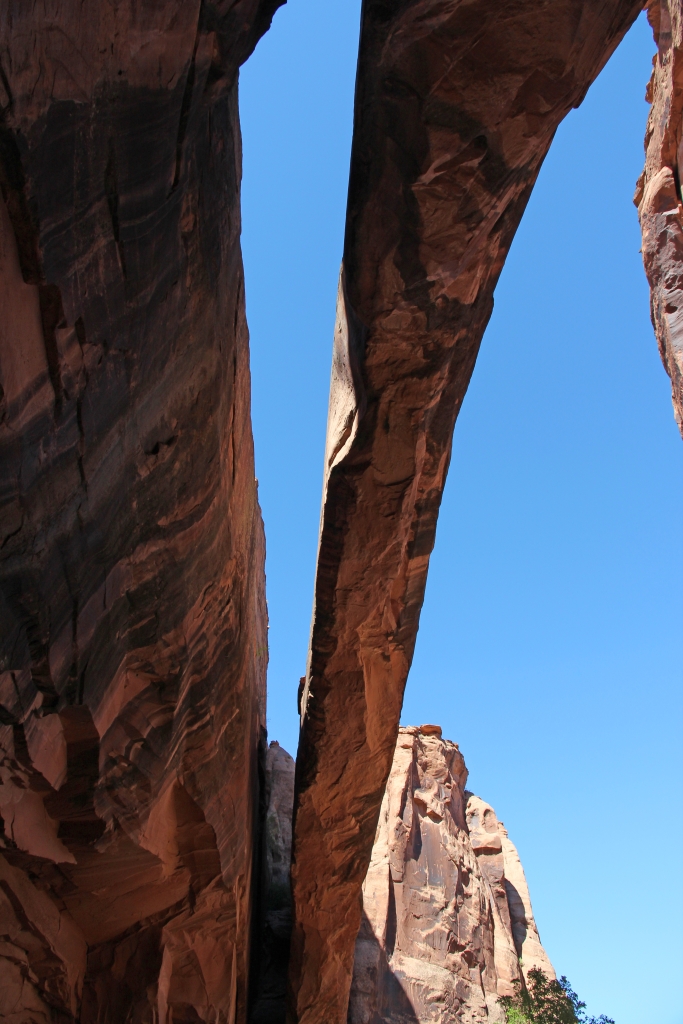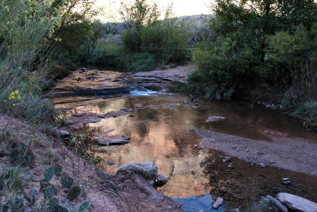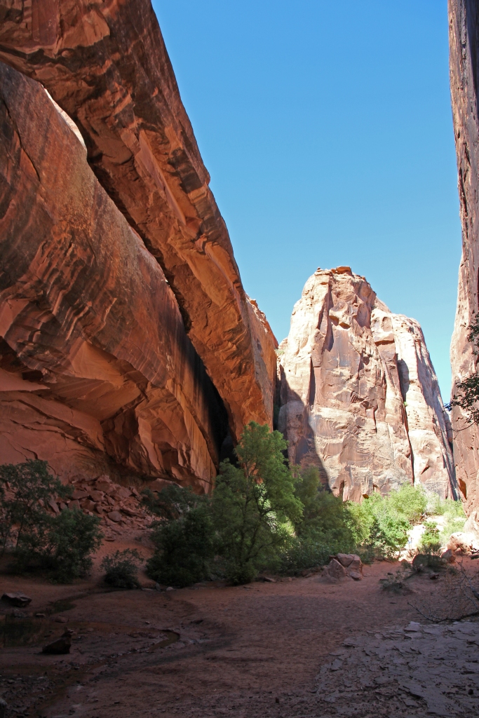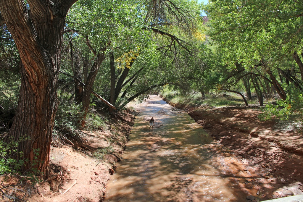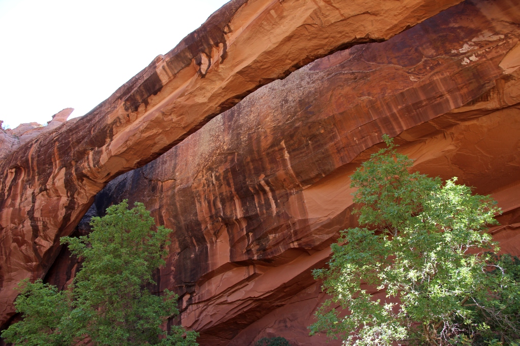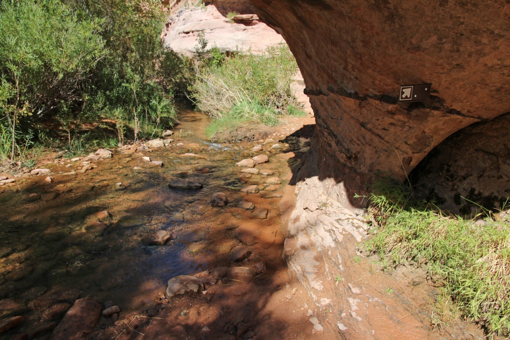 Wir machen uns wanderfertig und ziehen los. Der Weg ist intensiv begangen, nicht zuletzt von Leuten mit Hunden. Es gilt einige Furten im Bach zu überwinden – insgesamt sind es zehn (ich habe auf dem Rückweg alle fotografiert, um anhand der Fotozahl abzählen zu können). Aus den anhand der angegebenen 2 1/4 Meilen kalkulierten Stunde werden es fast 1 1/2 Stunden – laut GPS sind es auch in etwa 3 Meilen, was auch andere Mitwanderer bestätigt haben. Der Weg ist angenehm zu gehen, mit vielen schattigen und lauschigen Passagen durch relativ dichte Vegetation und bei angenehmer Temperatur von um die 20° C. Dennoch sind wir am Ende ganz schön durchgeschwitzt. Aber es hat sich gelohnt – über uns tut sich die gewaltige Morning Glory Bridge auf, ein großer Bogen, der allerdings leider nicht frei steht, sondern direkt vor einer Felswand.