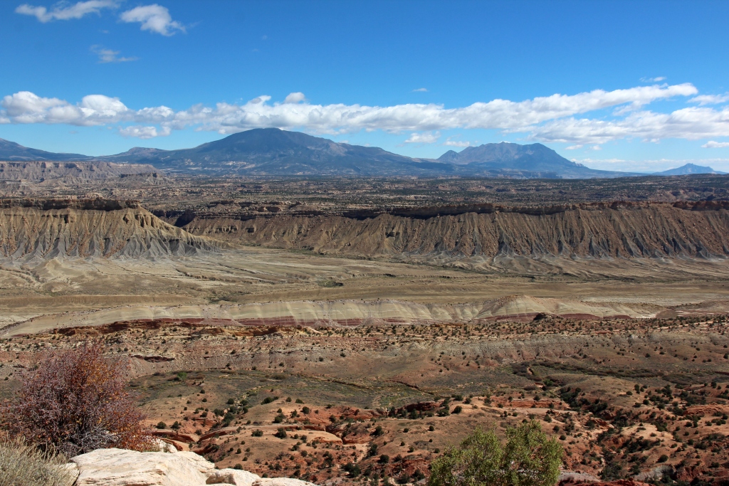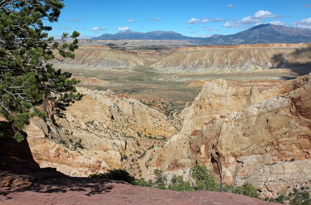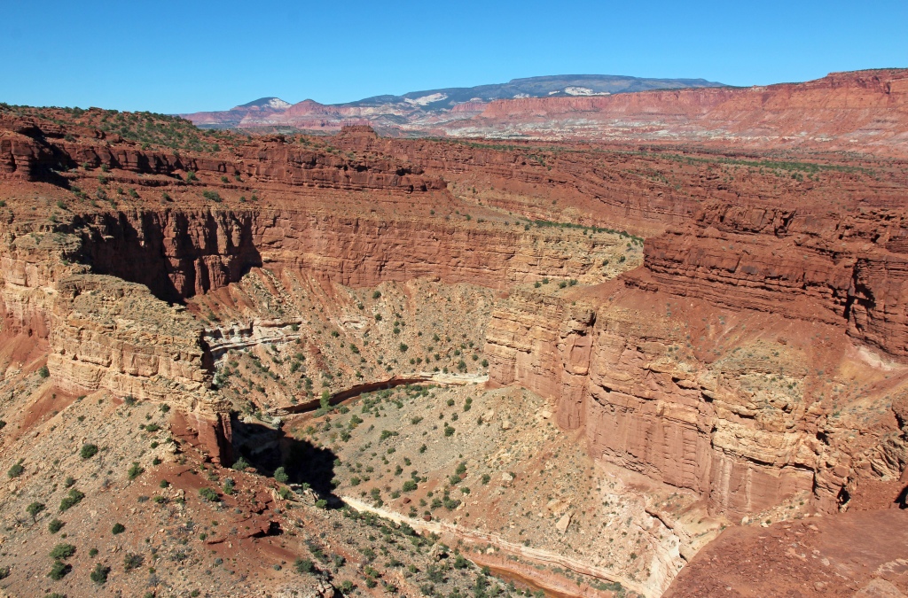 Schließlich biegen wir in die Upheaval Dome Road ein und fahren auch die zunächst bis zum Ende. Den Weg zum ersten Overlook verweigert Marianne, weil er als einigermaßen anstrengend beschrieben ist und wir noch ziemlich schlapp sind von der Morning Glory Bridge. Ich bin daher gar nicht so böse. Dafür fahren wir zum Green River Overlook, wo wir einen neuerlichen Blick auf die tiefen Schichten der Erdkruste nehmen.