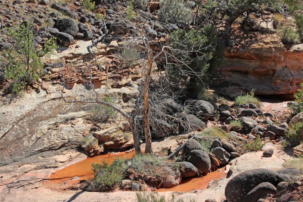 Der Weg ist nicht lang und führt an einem Bach entlang, der karamelfarbenes Wasser führt. Es handelt sich um einen teilweise künstlichen Kanal, "Tropic Ditch", der 1892 zur Versorgung der Orte Tropic und Canonvcille gebaut wurde. Nach nicht allzu langer Zeit sieht man den Wasserfall. Leider ist der Zugang gesperrt. Aber auch aus der Ferne beeindruckt die Brühe, die dort herunterschwappt.