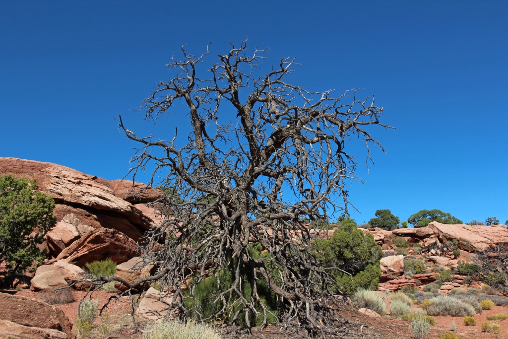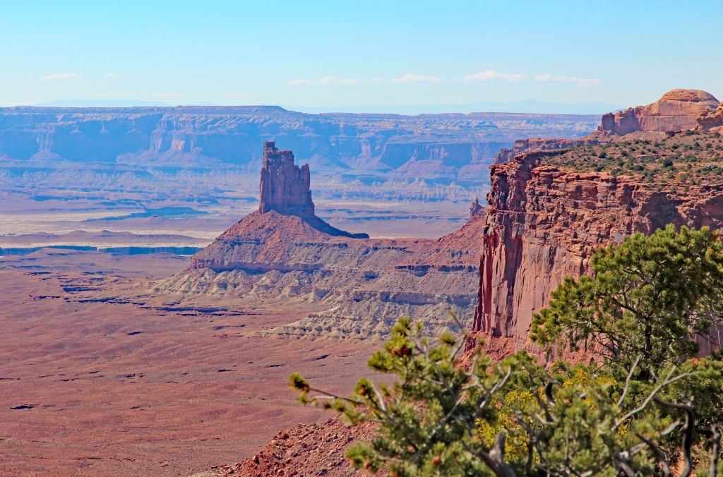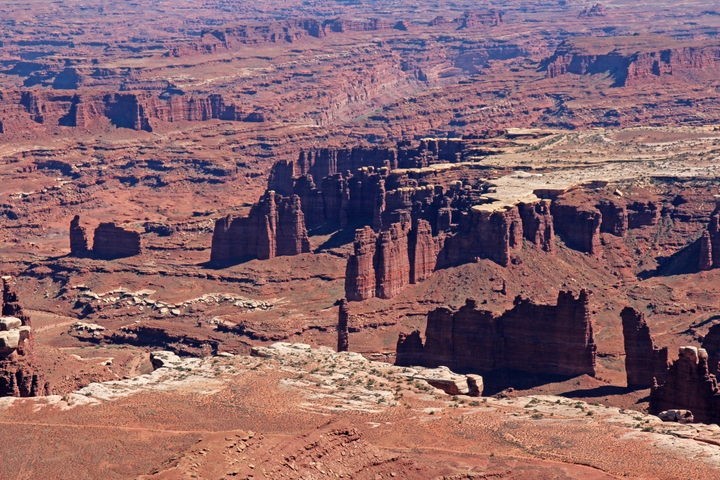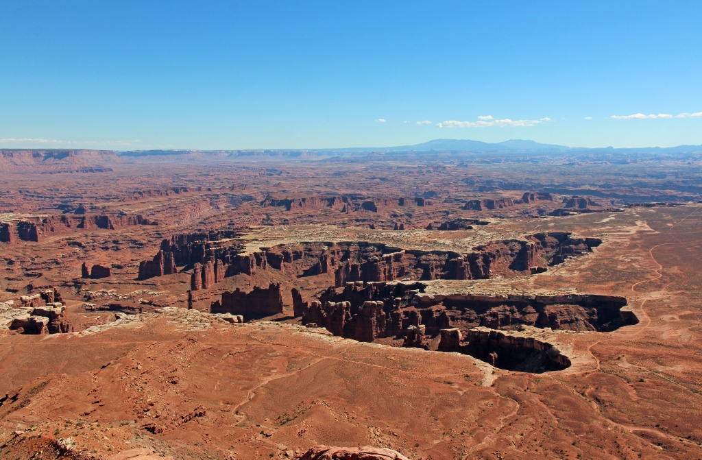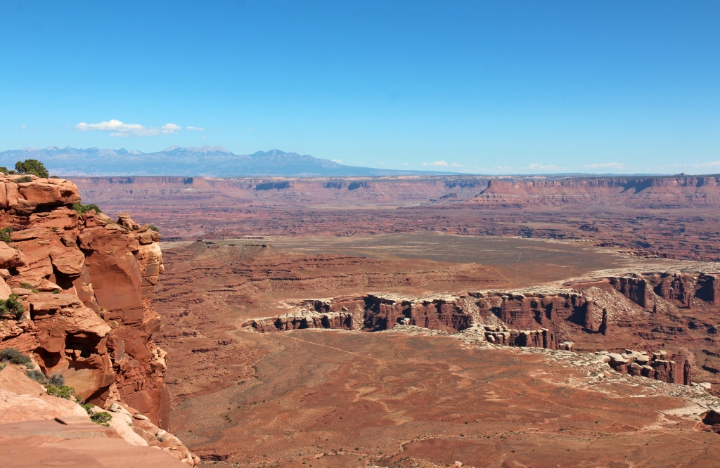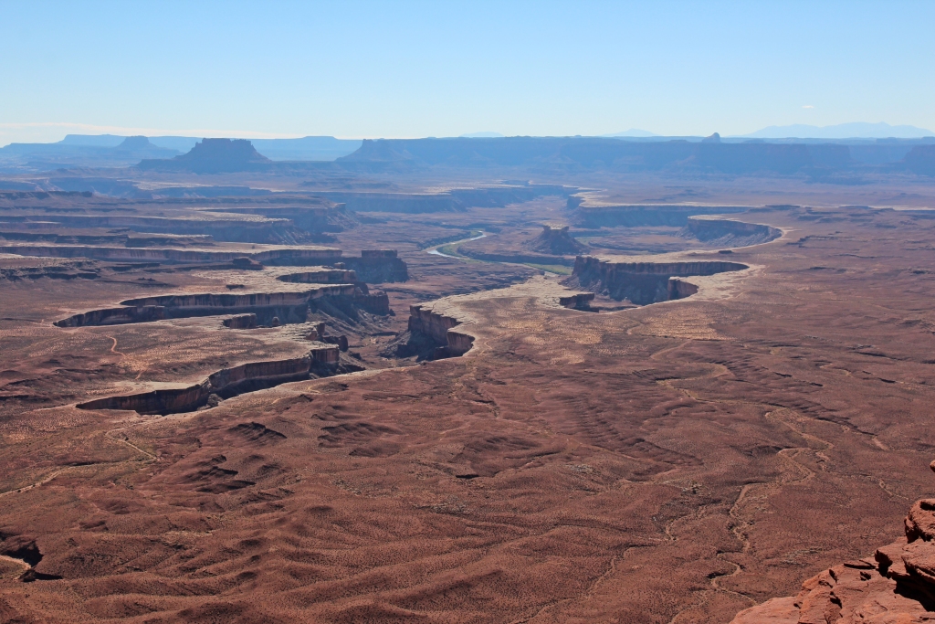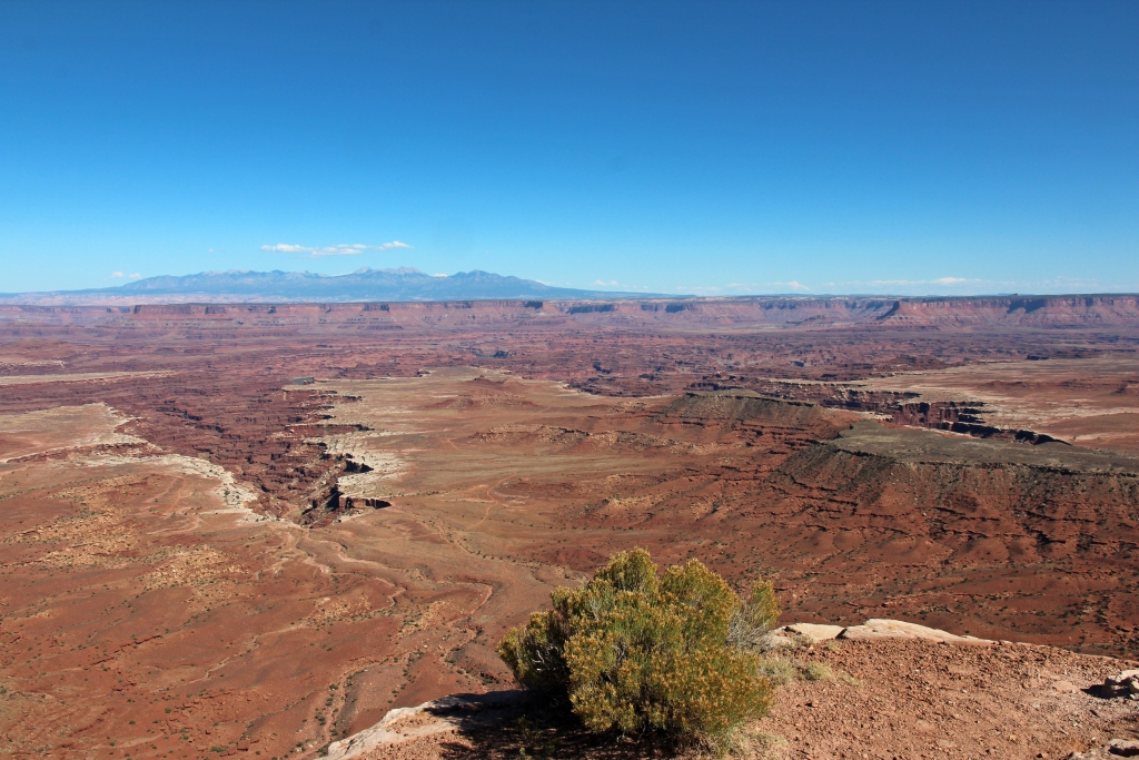 Wir beschließen, das restliche Tagesprogramm wieder "amerikanisch" zu betreiben. Wir fahren in den Canyonlands NP und dort bis ganz zum Ende zum Grand View Point. Hier hat man einen gigantischen Blick auf die Landschaft, wo sich die Erde stufenweise vor einem auftut. Wir tappen ein wenig umher und essen dann im Auto unsere verbliebene Pie vom Gifford House – Strawberry-Rhubarb. Der Rhabarber ist leider ziemlich hart und roh. Dann fahren wir zurück und halten an den kommenden Outlooks: Orange Cliffs Overlook, Buck Canyon Overlook.
